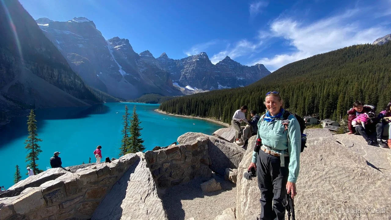 The shuttle ride to Moraine Lake is much longer than the ride to Lake Louise, about a 25 minute drive. After taking a quick bathroom break, we headed up the short trail for the Rock Pile to get some pictures of Moraine Lake. The Rock Pile Trail is only half a mile with an elevation gain of 32 feet.