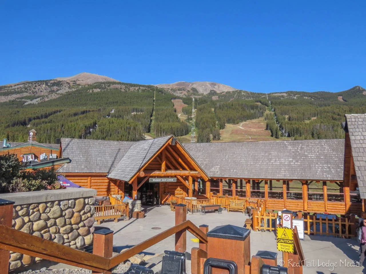 We would have loved an ice cream after our hike. There is the large and luxurious looking Fairmont Chateau on the shores of Lake Louise. It looked like there were shops inside the hotel, but the grounds were for registered guests only and not open to the general public. There is nothing else right at the lake. Surprisingly, we did not have a very long wait to catch the shuttle bus back to the Park & Ride and got on the very next bus. Surely the Lake Louise Ski Resort would have ice cream. As we got off the bus, we got excited when we saw an ice cream cone on one of the signs. However, when we went inside the lodge, the only thing open was a coffee bar, which had a limited selection of sandwiches and pastries, but no ice cream. Bummer! Instead, we bought a couple of Cokes. We sat down to relax while we enjoyed our refreshing beverages before catching the shuttle back to the campground.