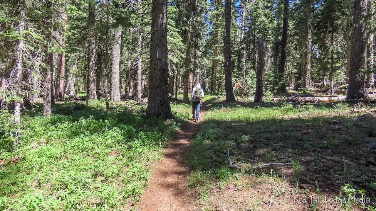 After lunch, we continued our walk. The High Lakes Trail is a little over 9 miles long and runs from the far side of the Great Meadow, past Lake of the Woods, and continues to the far side of Fish Lake. We walked a small section of it. First we went over to the Great Meadow, then followed the trail to the tip of Lake of the Woods. Then we followed the shoreline of Lake of the Woods back to our campground. A social trail continues past the campground and over to the cabins of the resort.
