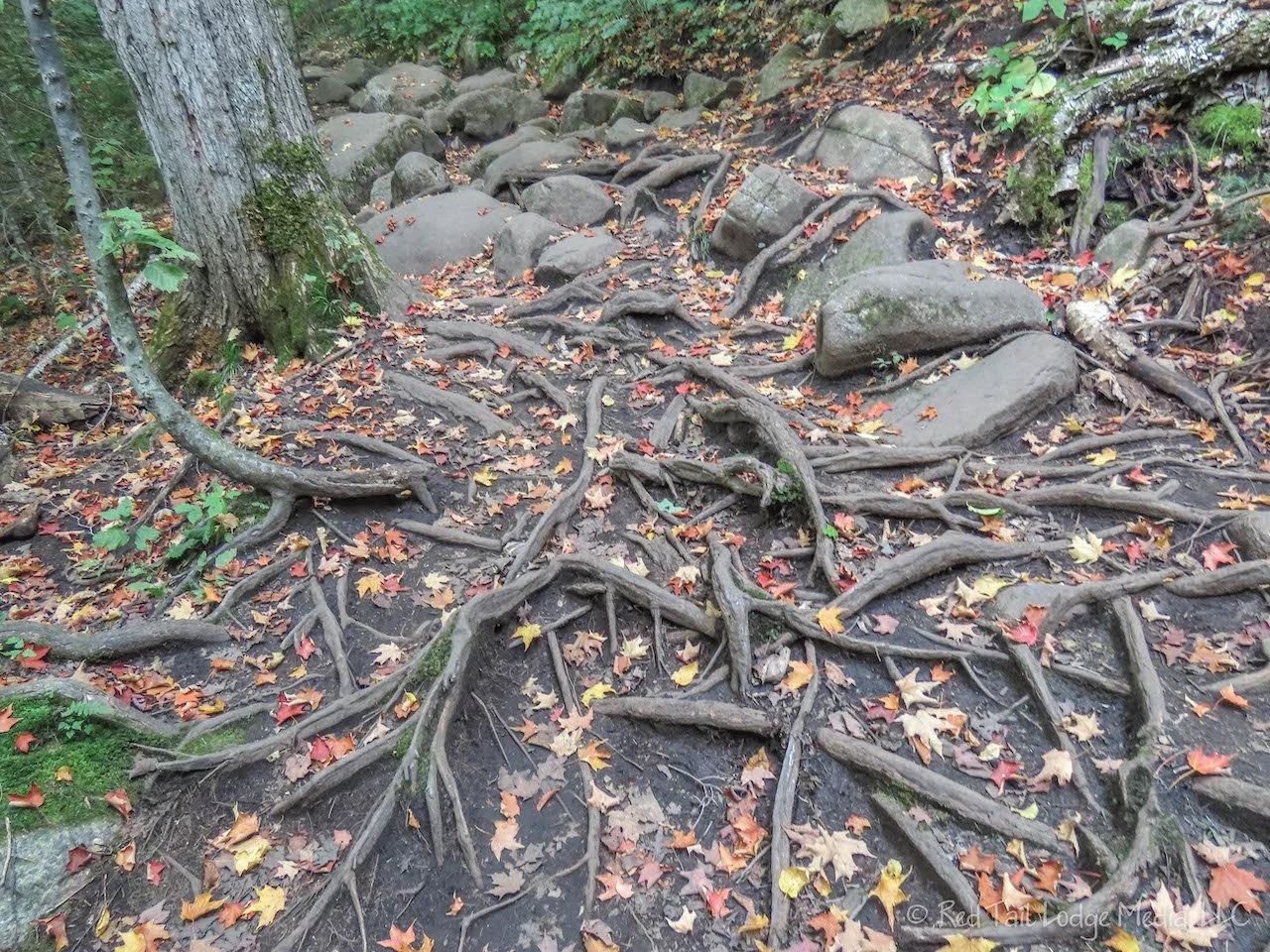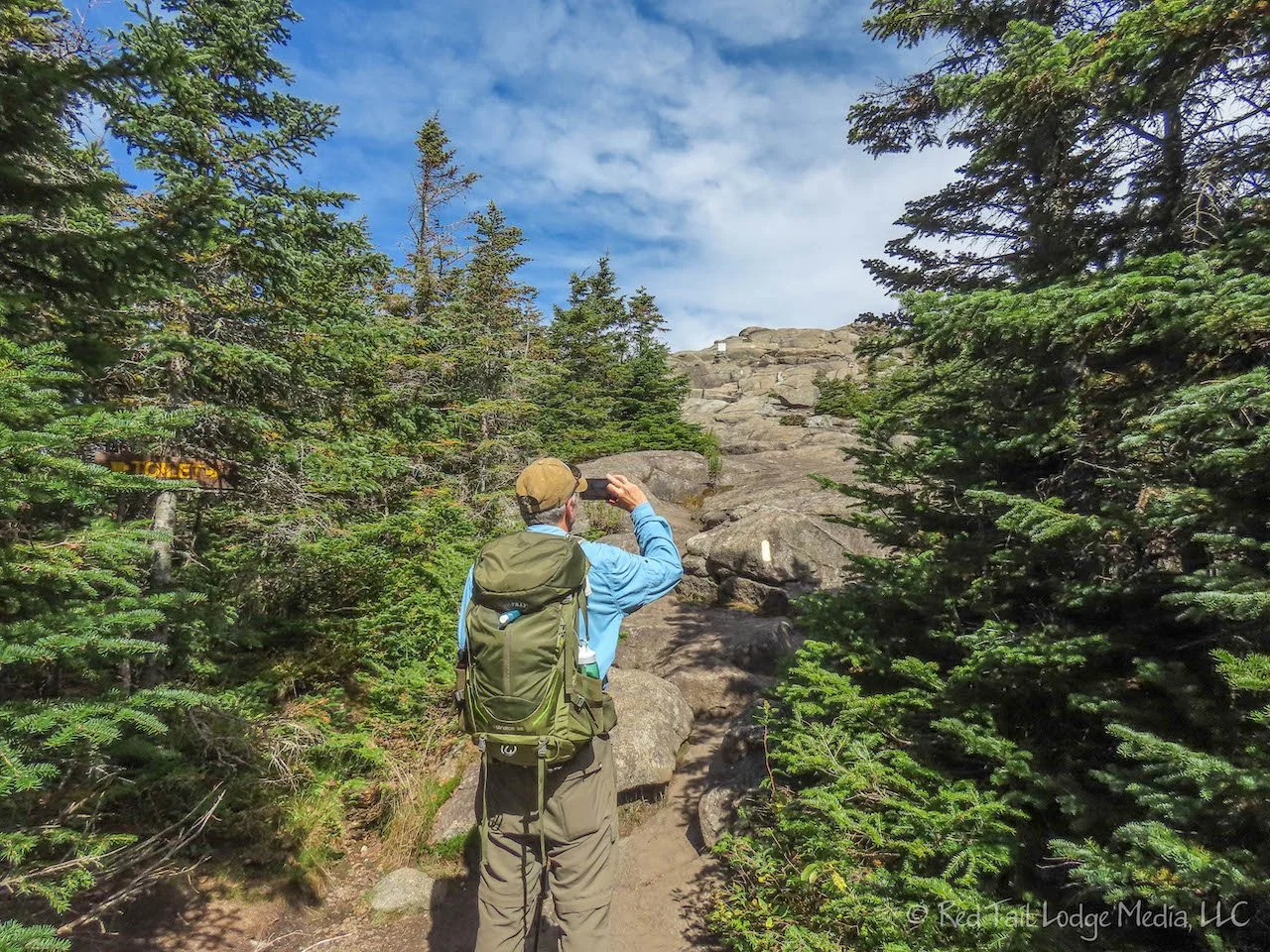 The trail is not marked in the traditional sense. There are no blazes or signs along most of the trail. But it is easy to follow the trail of rocks and boulders through the woods. Near the summit, when you leave the trees, the trail is marked with blazes painted on the solid rock along with rock cairns marking the route to the summit.