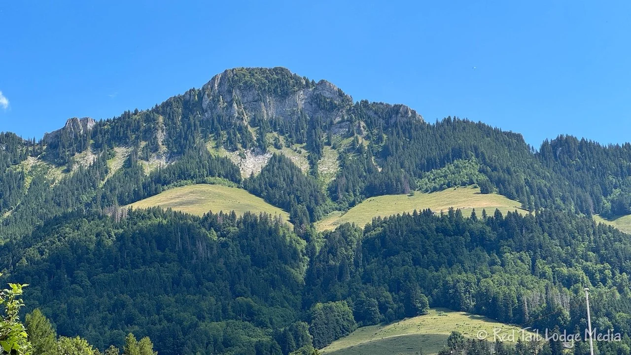 As the train left Montreux, it started climbing up the mountain, winding its way back and forth as it climbed. Even though we spent some time in tunnels, there were plenty of beautiful views back down to Lake Geneva (Lac Léman) and of the mountains. On the train, they gave us a bread roll, a piece of Callier chocolate, and our choice of a hot drink (hot chocolate, coffee, or tea). They had a variety of teas to choose from. Ann had the lemon and ginger tea.