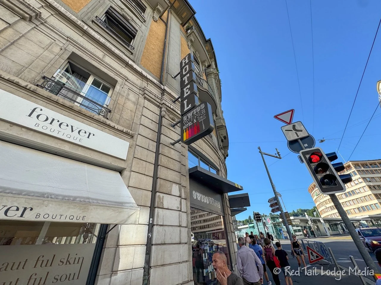 Lausanne sits on the north side of Lake Geneva (Lac Léman), but the train station is about half a mile from the lake. Once we arrived, we strapped our luggage onto our backs again and walked to our hotel, Hotel Swiss Wine by Fassbind. It was only about a 15 minute walk, but it was uphill the whole way. Temperatures were in the upper 20’s Celsius (80’s Fahrenheit), so it was a rather warm walk.