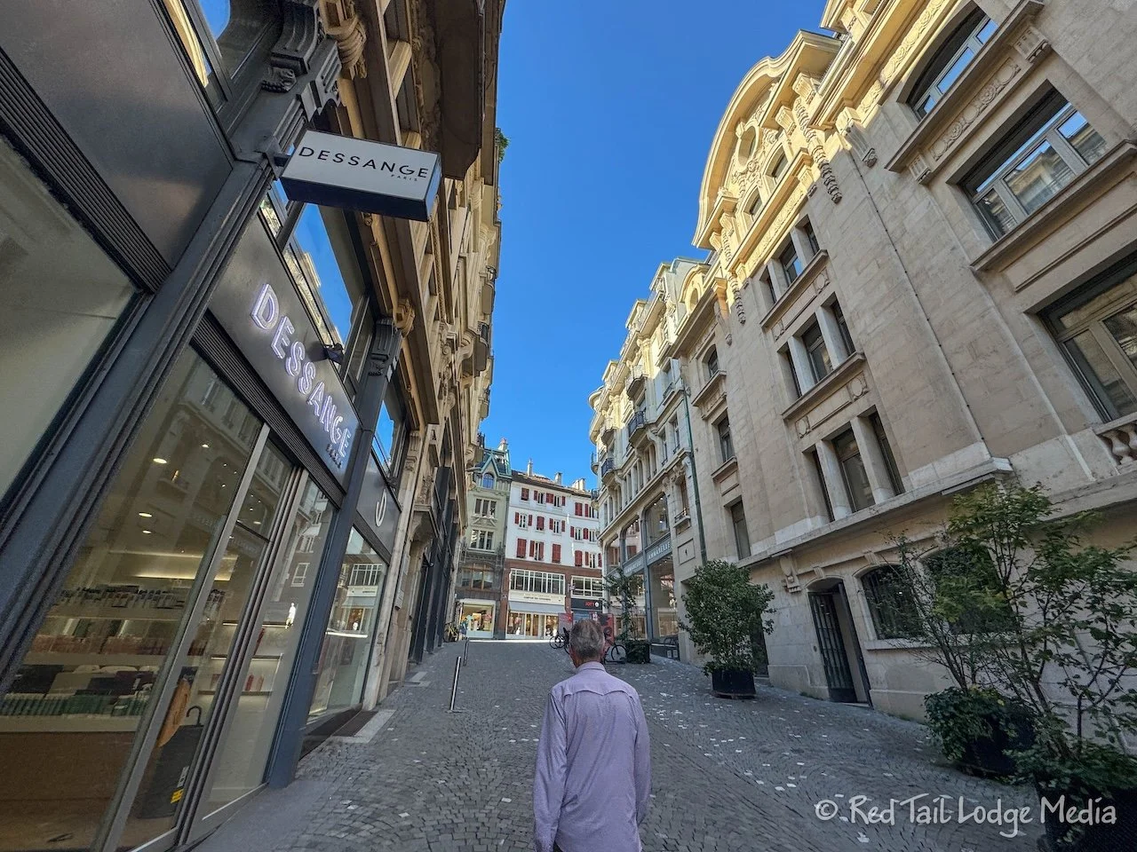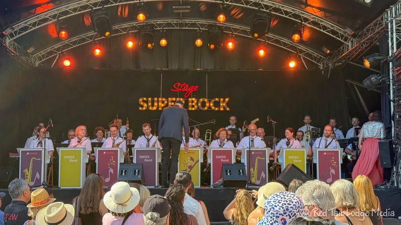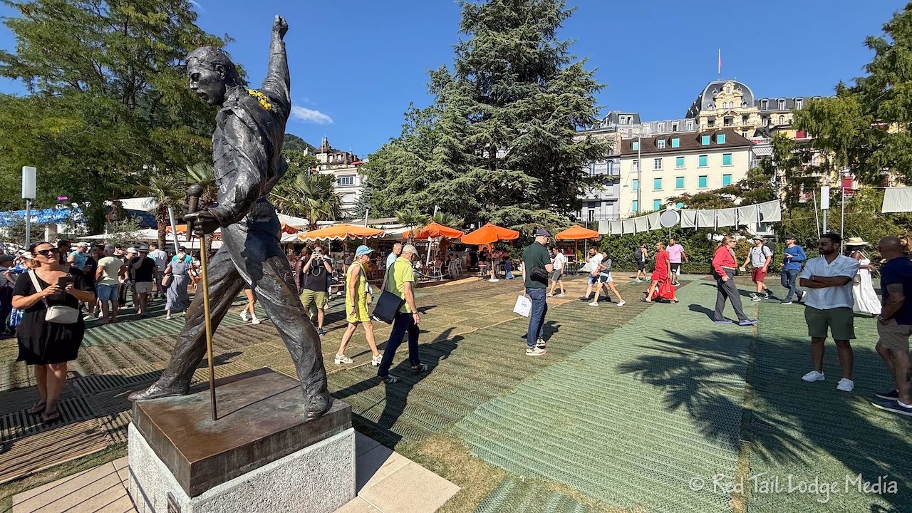 From the train station, we headed down to the lake, just a few blocks away. The Montreux Jazz Festival was in full swing. The festival lined the shoreline with food and bar booths along with various stages for performers. Most of the headliners needed tickets, but there were some stages that were free to the public to attend. In addition, there were some street performers playing. We stopped and listened for a while to the Swiss Band. The band consisted of employees from Swiss Air airlines. They played a variety of big band and swing tunes.