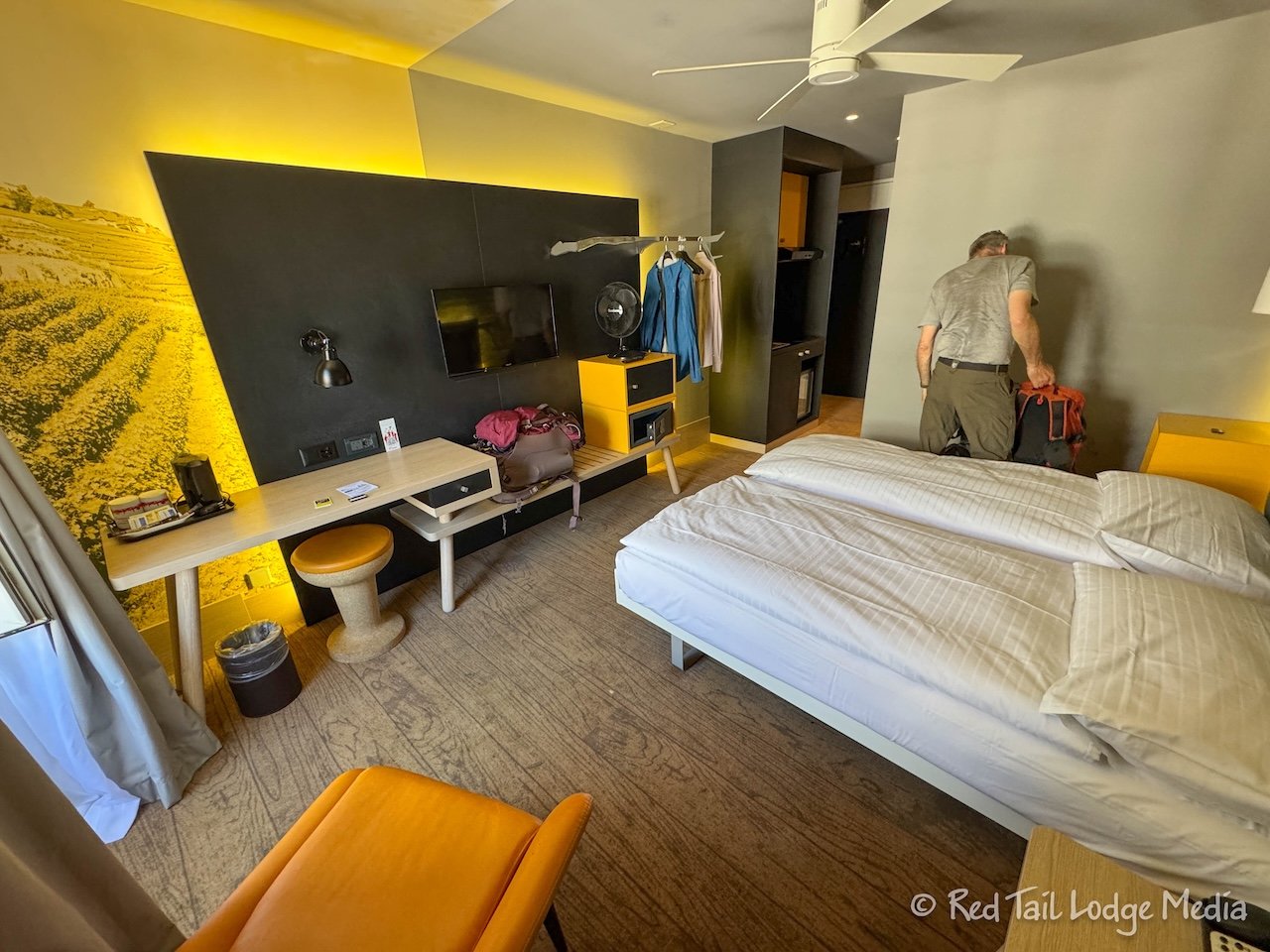 When we checked into the hotel, we learned that the hotel did not have air conditioning. Our room was up on the 5th floor, five flights up, but luckily they had an elevator. The room was a little warm when we arrived, but after we opened up the window and turned on the ceiling fan, it cooled down to a comfortable temperature. There was also a desk fan that we turned on that night to help us sleep. Lausanne is a busy, noisy, city and we had to close the window at night to keep the noise out. Thankfully, the window is well insulated and we couldn’t hear any noise when it was shut.