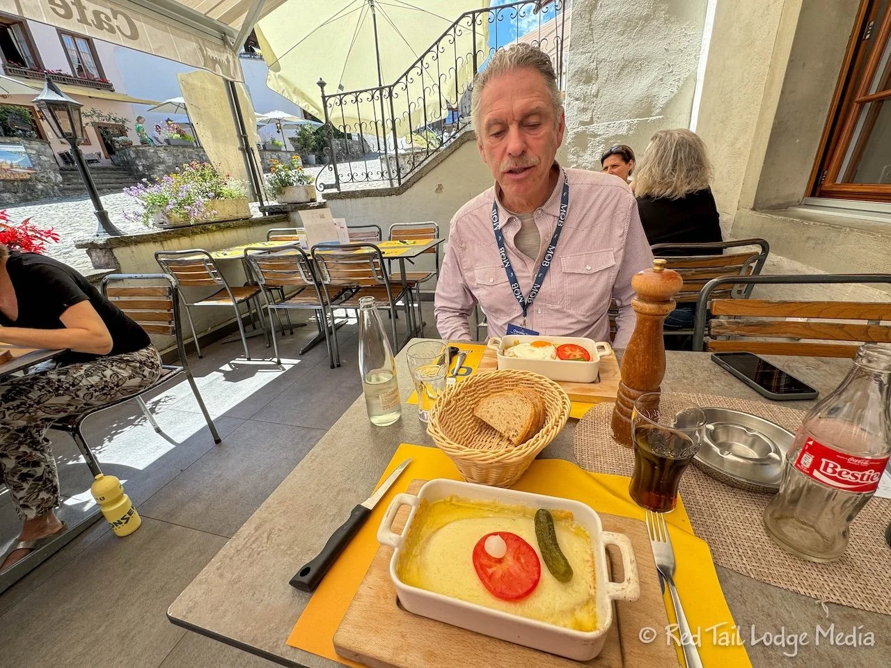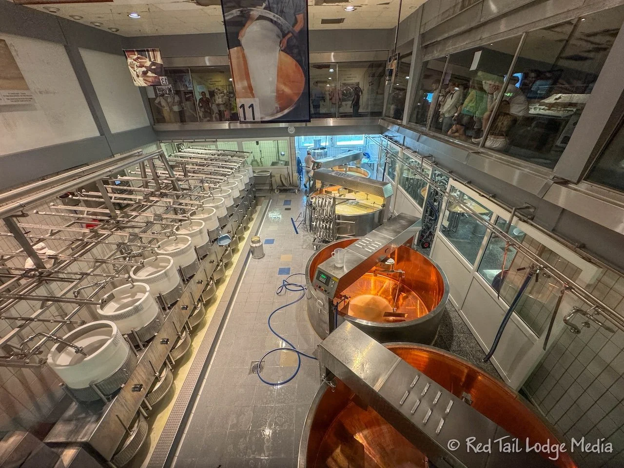 When we arrived in Montbovon, we immediately transferred to a double-decker bus that transported us to the Gruyère cheese museum (Maison Gruyère). We were given audio guides in the language of our choice which guided us through the exhibits in the museum. Part of the museum looked down into the factory where we could see the cheese being made. They also gave us cheese samples so we could try to tell the difference between different aged cheeses, 3 months, 6 months, and 9 months.