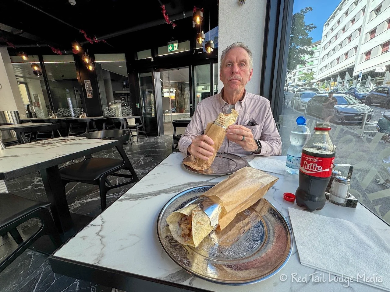 The Kebab Durum is a wrap filled with typical döner kebab ingredients. What they were trying to ask us is what kind of meat did we want, beef or chicken? We took both, with all the fixings and the spicy sauce. The wraps were delicious, much better than the döner kebabs we had in York (York, England - May 20th to 22nd and June 20th to 23rd, 2025) and Amsterdam (Amsterdam, Netherlands - June 29th to July 3rd, 2025), but those were fast food chains. We were hoping to have something on the lighter side, but the wraps were huge, even by American standards. We managed to finish them anyway because they tasted too good to waste.