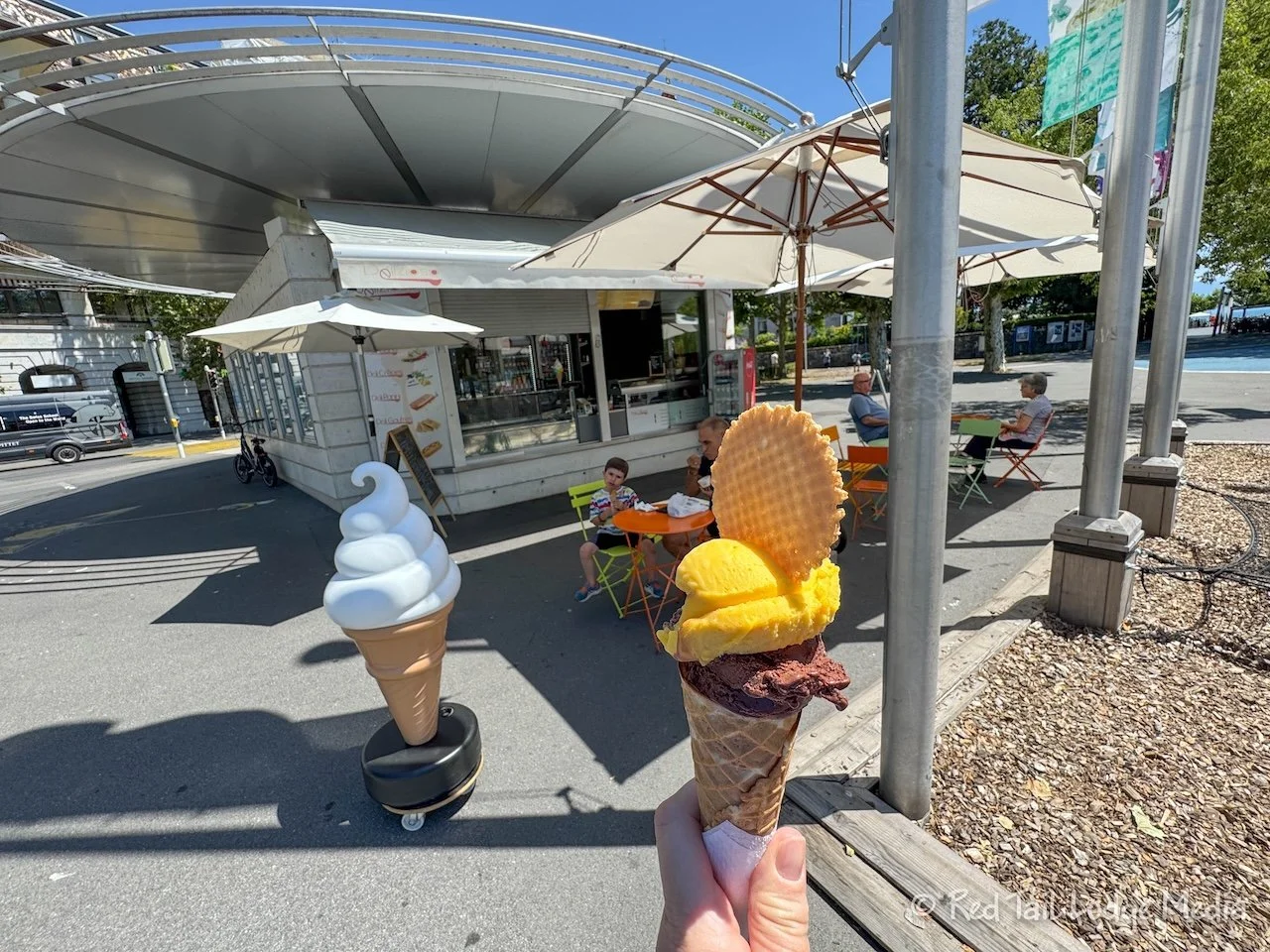 After lunch, we made our way to the lake. It was over a mile away. When we reached the lake, Ann stopped at an ice cream stand to get a cone, one scoop of mango and one of chocolate. It hit the spot on the hot day.