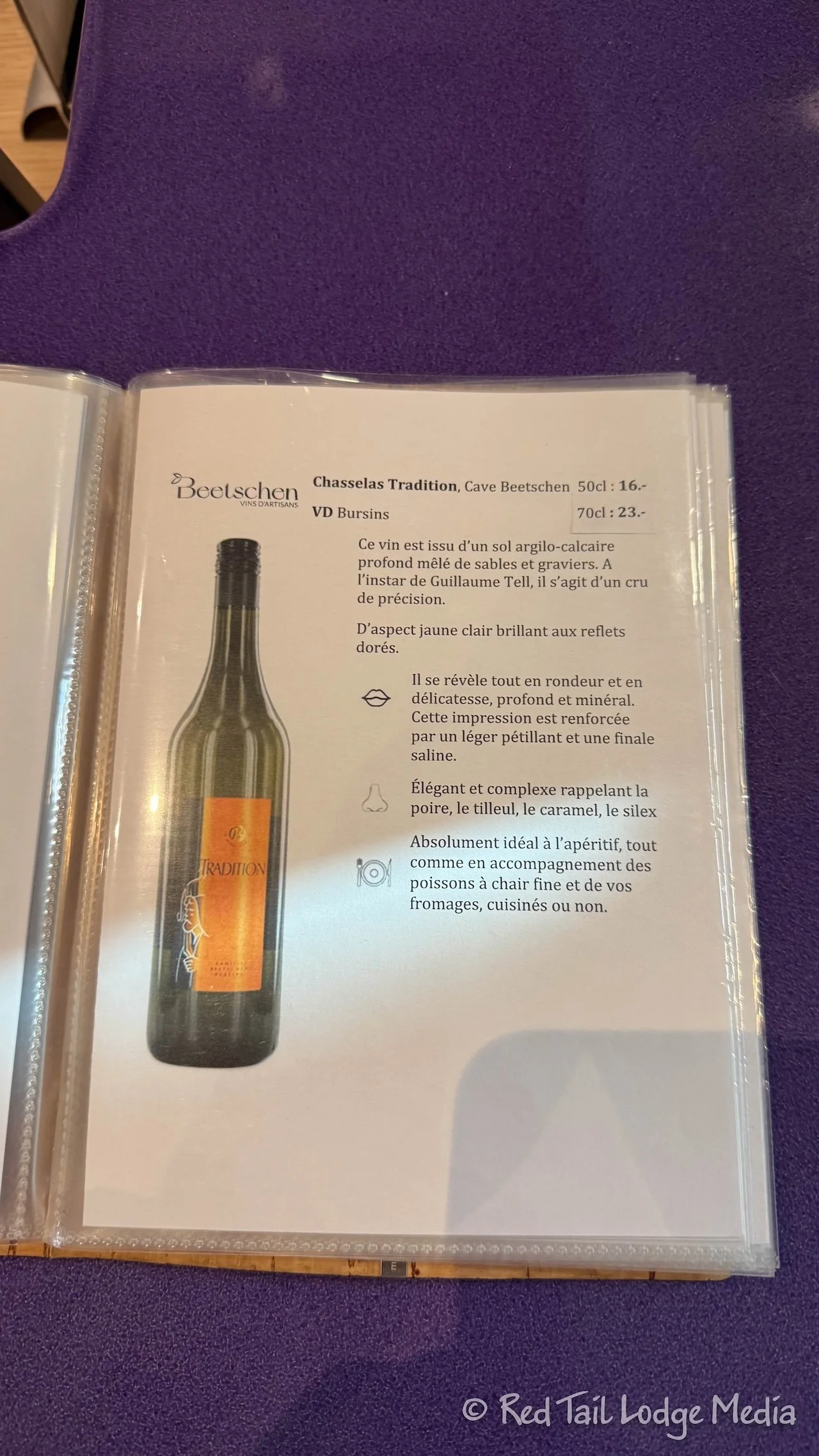 Back at the hotel, Keith bought a bottle of wine at the front desk, called Chasselas Tradition from winery Beetschen. Since Ann was not feeling up to it, only Keith drank some of it. There was a refrigerator in our room, so he saved the rest of the bottle for the following evening.