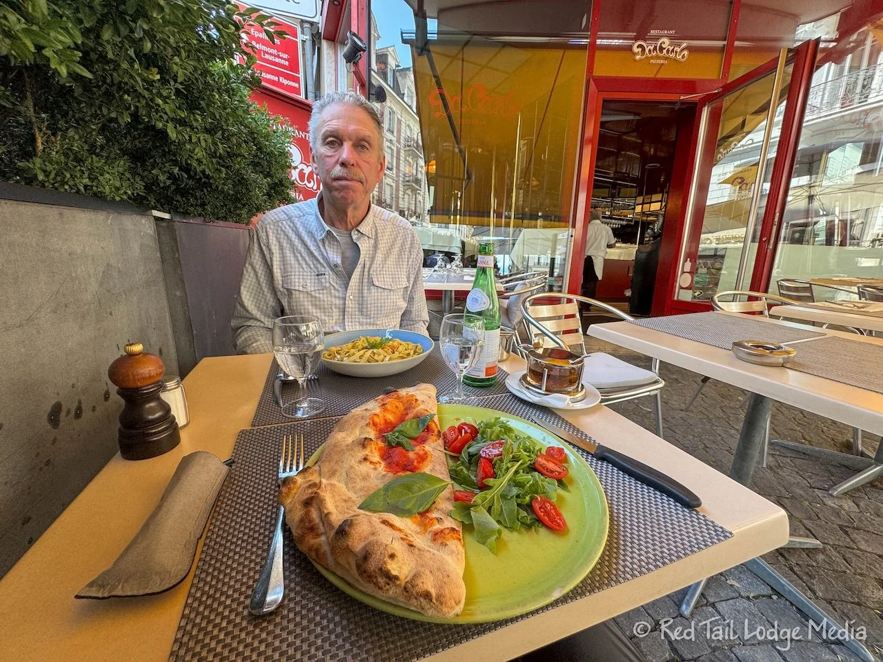 Keith ordered a pasta dish called Tagliatelles Da Carlo with mushrooms and ham. Ann had the Pulcinella, which was a pizza folded over in half with spicy salami, smoked mozzarella, and ricotta. It was similar to a calzone, but somehow a little different. When we went to pay for the bill, Keith tried to round up the amount to 61 francs in French, saying “soixante et onze, s’il vous plait”. The waiter corrected him. “Onze” is eleven, so what Keith said was 71 (sixty and eleven) in French. What he should have said was “soixante et un” (sixty and one). Merci!