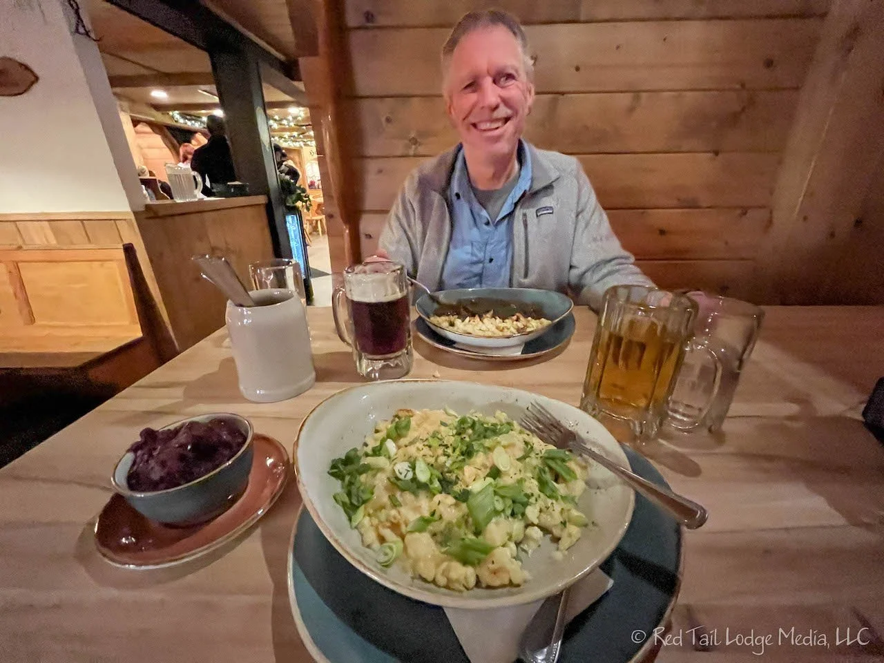 After putting away our clean laundry, we walked into town and spent the rest of the day there. Continuing our experience of the Bavarian village, we had lunch at the München Haus beer garden. Keith ordered a weisswurst while Ann get the bratwurst along with sides of German potato salad. We both loaded our sausages with apple cider sauerkraut and one of the dozen or so mustards available. Ann chose the spicy brown mustard while Keith had the champagne honey mustard. München Haus also served Icycle Brewing Company beer, the same that Keith had the evening before. This time he chose the Oktoberfest Dunkel beer.