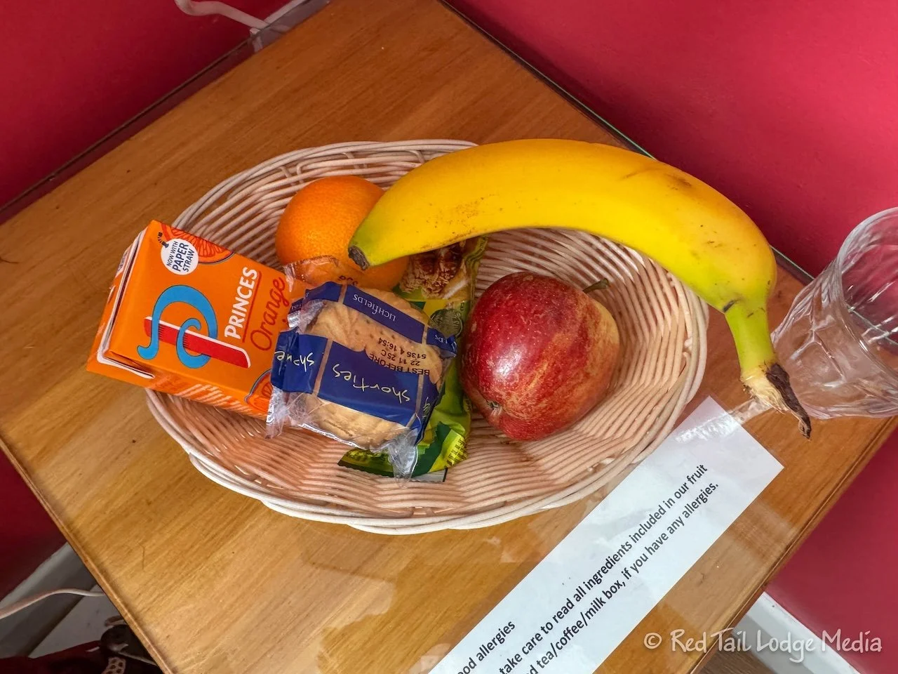 Wednesday morning, we ate our fruit baskets for breakfast. The basket contained bananas, apples, granola bars, oranges, cookies, and a juice box. Then we headed out to catch a hop on-hop off bus tour.