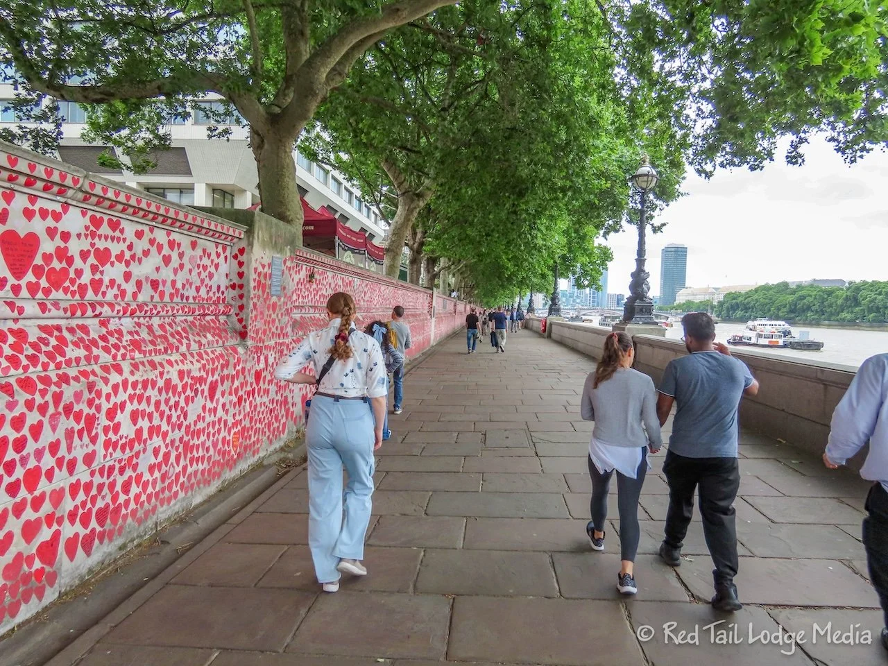 We continued walking south along the river. On the wall beside us was the National COVID Memorial Wall. There was a red heart painted on the wall for each person who died in the United Kingdom from COVID. Bereaving families have put the names of their loved ones in some of the hearts. There are more than 240,000 individually hand-painted hearts on the wall, which stretches for 500 meters (1640 feet).