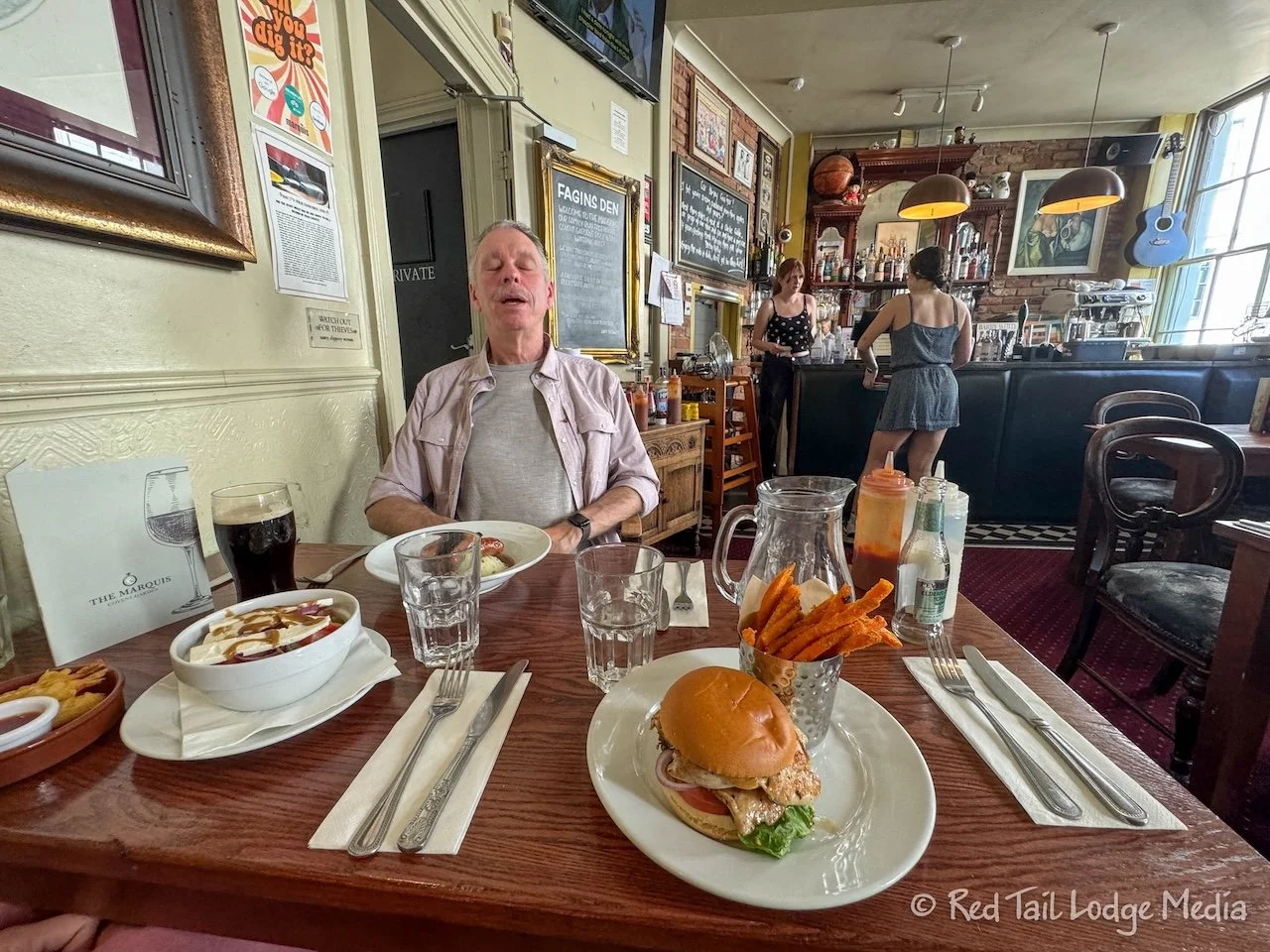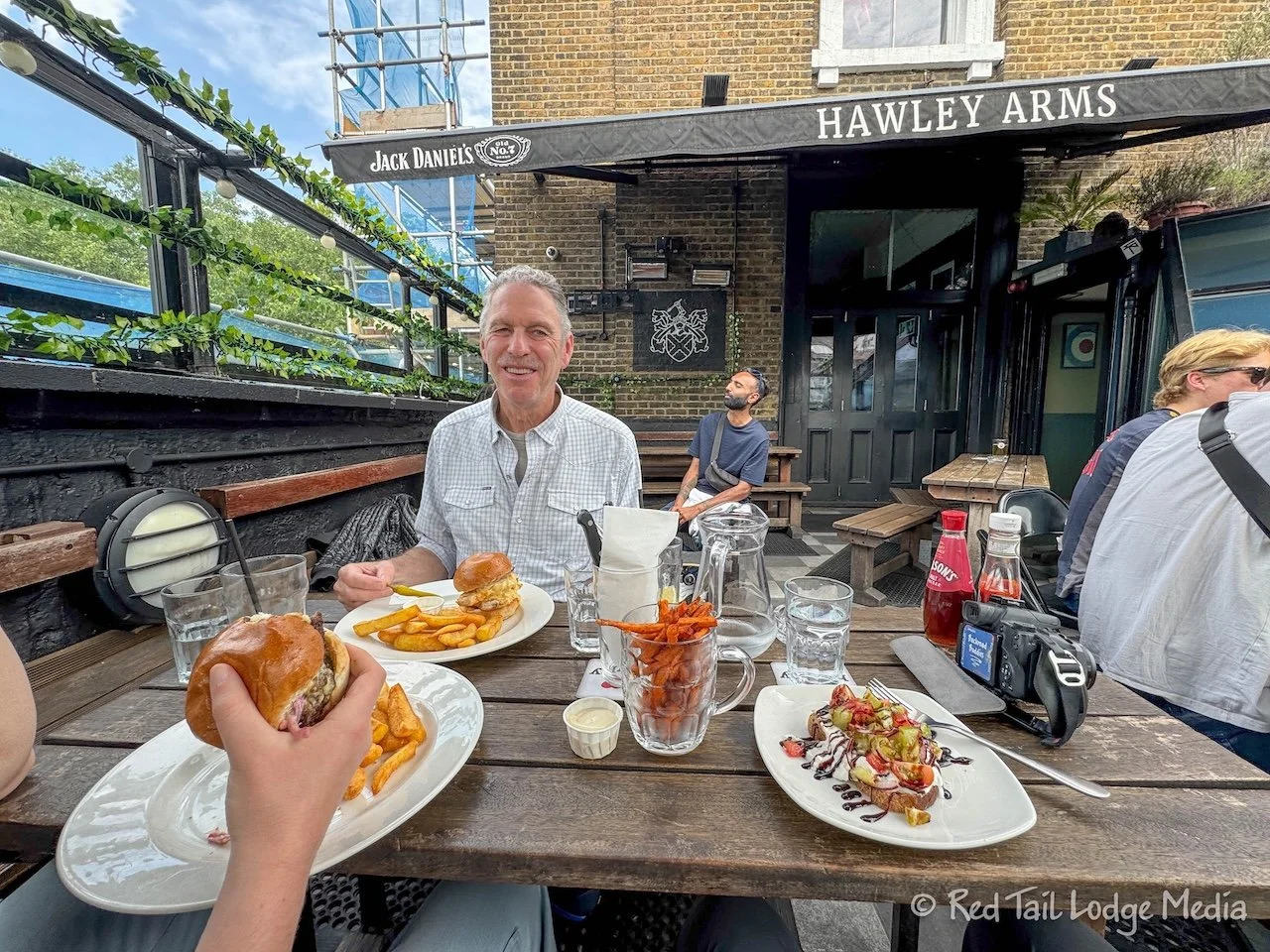 The Camden Market was on our daughter’s list of things to see in London. After a quick browse of the market hall, we went over to the Hawley Arms pub for lunch. It was getting late, after 1:30 pm, and we were hungry. We went up to the roof terrace. The open air was nice, but that is also where the smokers sat. As Americans, we are not used to that anymore, since most places in the States don’t allow smoking at restaurants, even outside.