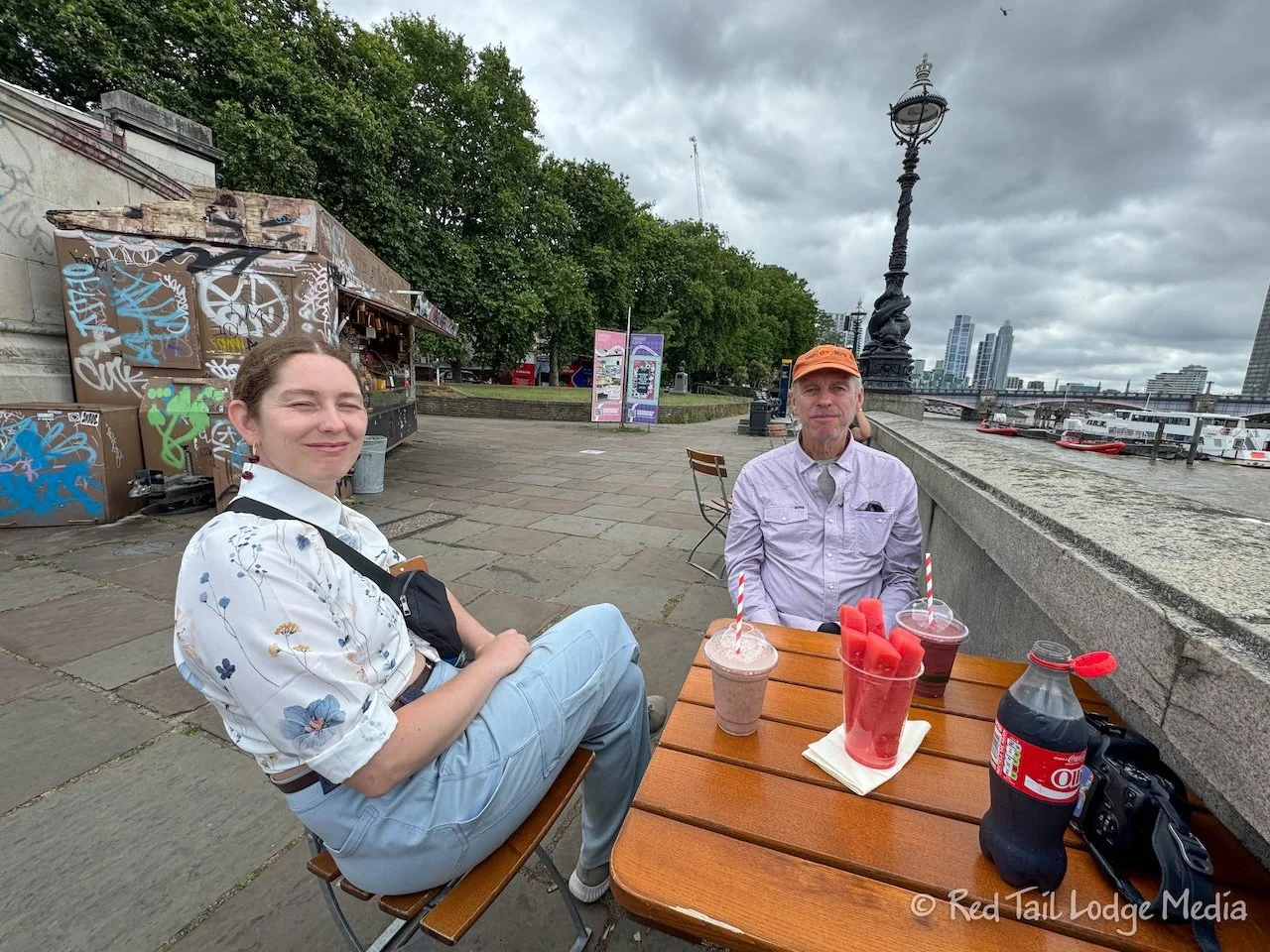 After touring the abbey, we had some time to wander around the area. We had timed entry tickets for the London Eye at 15:30 (3:30 pm). The London Eye was just across the River Thames from the Abbey. It was a Thursday, so there was a Food Market in the St. Thomas’ Riverside Garden. It was lunch time, so we each picked out a different type of food. Ann picked a stand with Sri Lankan food. She tried the parotta, fried egg, and chicken curry with yogurt, and pickled onion. Parotta is a layered fry bread. Kirsten went to a Turkish stand and got their gözleme. It was a stuffed flatbread that Kirsten said reminded her a little bit of a quesadilla. Keith stopped at the Afghan stand and ordered a chicken wrap. The Afghan wrap was served on a fresh naan bread with black pepper yoghurt, fresh mixed salad, seasoned boiled potatoes, and a green secret sauce. All of our food choices were delicious.