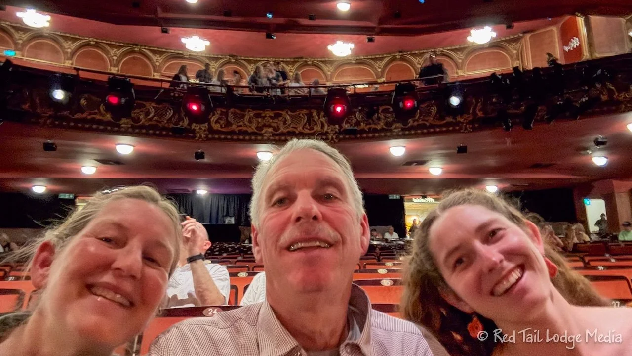 The pub was packed, but no one was in the restaurant upstairs. It wasn’t even 5 pm yet, so we had to let the staff down in the bar know that we wanted to be served upstairs. There didn’t seem to be any air conditioning, or it couldn’t keep up in the heat, because it was warm inside, even with the windows open. However, by the time we left, all of the tables were taken. For dinner, Ann chose the chicken burger with guacamole and sweet potato fries. Kirsten opted for a prawn starter and a Caesar salad. Keith ate the bangers and mash. After filling our bellies, we walked back to the theatre.