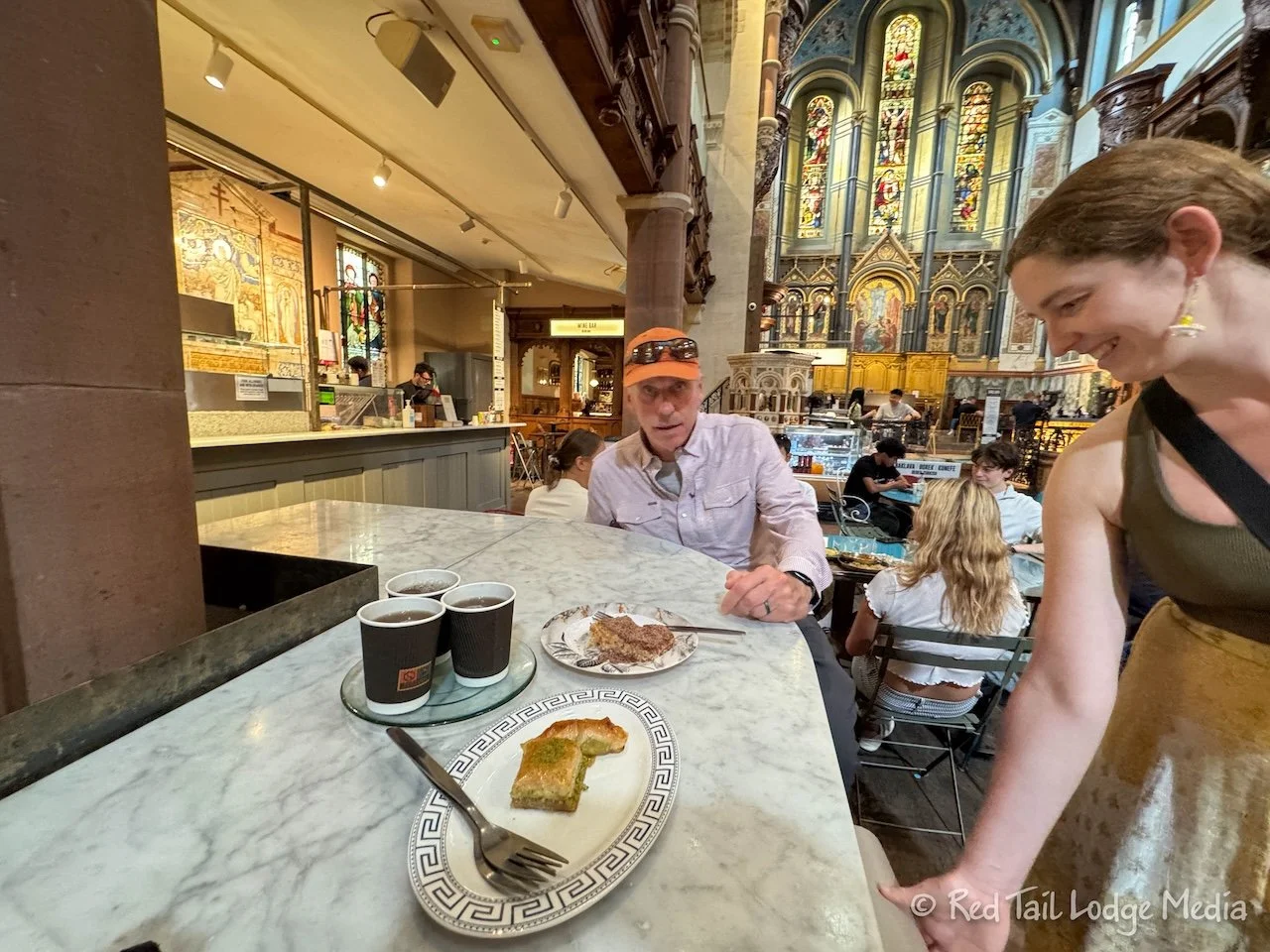We stopped and had some baklava along with Turkish tea from the Bebek Turkish stand. We tried three different types of baklava, including a chocolate one. The chocolate baklava was served cold, soaked in milk with cocoa powder on top. It was very refreshing on a hot day. The Turkish tea was a type of black tea served with a sugar cube. We enjoyed our treats while staring at the beautiful stained glass and intricate wood carvings inside the church.
