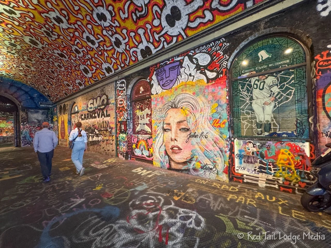 The tunnel is located under the train tracks near the Waterloo Train Station along Leake Street. The official name for the graffiti tunnel is the Leake Street Arches, where graffiti is legal. The artwork inside the tunnel was spectacular. There was even a restaurant inside the tunnel. Kirsten noticed that one of the art pieces on the ceiling was commissioned by the German Embassy in London.