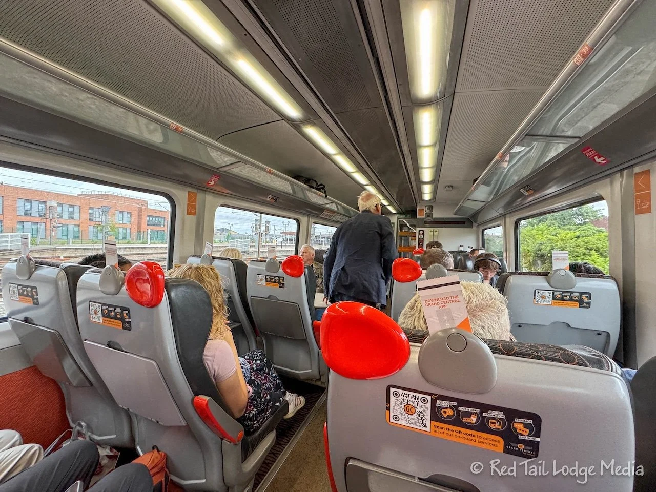 The train ride itself went pretty smoothly. We had reserved seats with seat trays for our electronic devices. We were riding a Grand Central Rail train this time, one we hadn’t been on before. The seats were comfortable. Instead of electronic light indicators above the seats indicating which seats were reserved, there were physical cards stuck in slots at the top of the headrests for each seat.