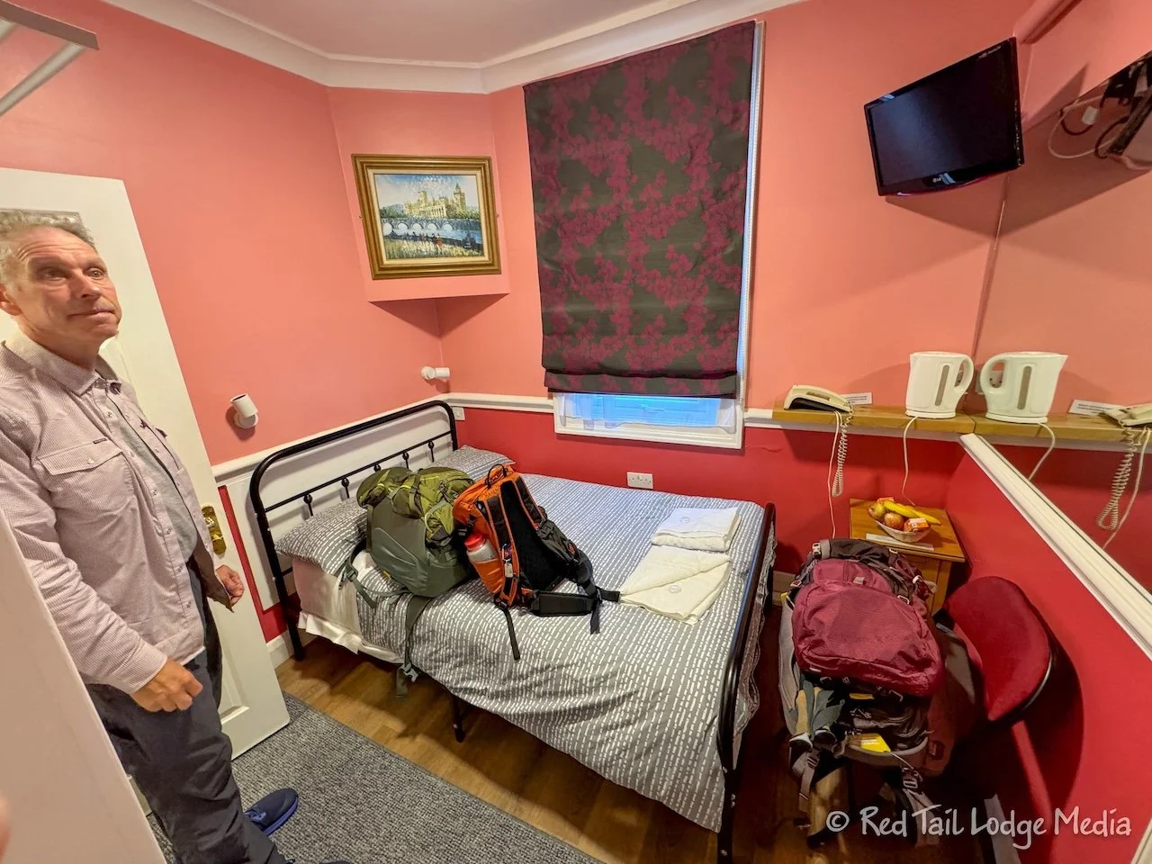Our daughter, who had just flown over to London, arrived at the hotel just minutes before us. The hotel and our rooms were very small, but had everything we needed. They didn’t serve breakfast, but they had a fruit basket in the room along with the obligatory electric tea kettle, tea and coffee supplies. The room is so small that the double bed was pushed up against the wall. That meant that Ann had to crawl over Keith to get in or out of bed. But at least the place had air conditioning, as the temperatures outside were warming up. It was the first place we’ve stayed so far in Europe that’s had air conditioning.