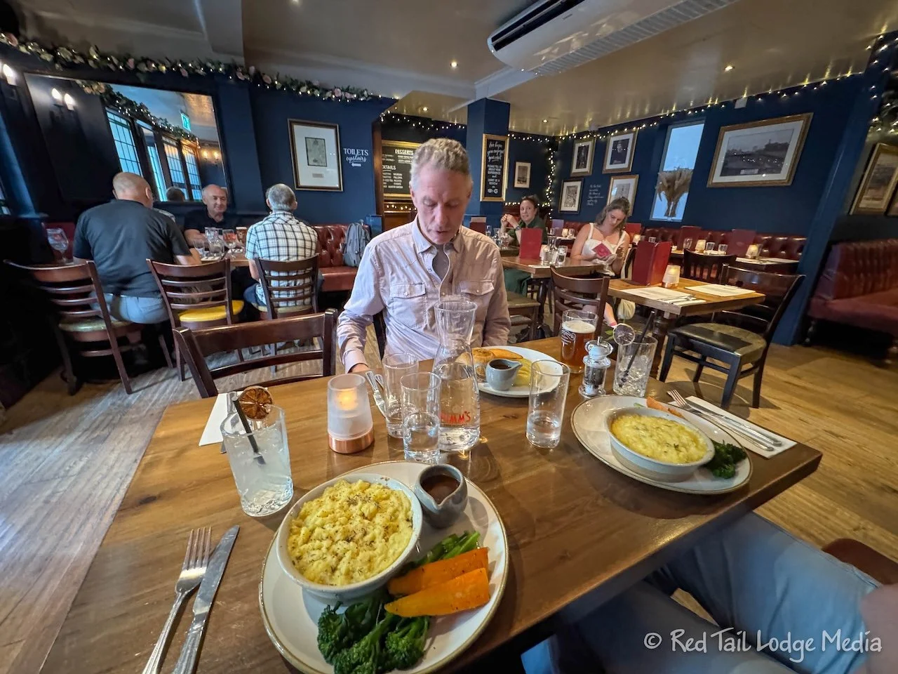 The tavern had a wonderful selection of food. Kirsten got the lamb chops. Keith ordered the ham terrine starter with a side of dauphinoise potatoes. Ann had two sides, broccoli and creamed corn with chili. We all enjoyed our meals.