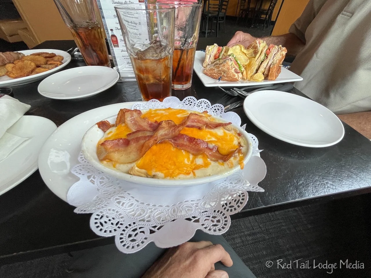 Wednesday, we met relatives at the Bristol Bar & Grill in Louisville. While Keith had the club sandwich, Ann tried the Hot Brown. The Hot Brown is a dish local to Louisville, created by the Brown Hotel in the 1920’s. It is a variation of the Welsh rarebit. The Hot Brown is an open-faced sandwich with turkey, ham, & bacon covered in a Mornay sauce and baked. Bristol Bar’s version does not contain ham, but adds cheddar cheese and tomato. It was pretty tasty.