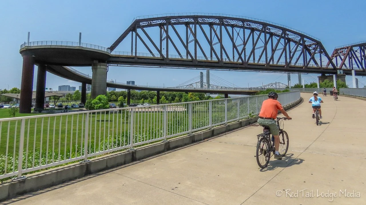 From the Lincoln Memorial, we walked over to the Big Four Bridge. The bridge was a railroad bridge over the Ohio River, built in 1895. The name Big Four refers to the railroad company that used the bridge, the Cleveland, Cincinnati, Chicago and St. Louis Railway, whose nickname was the Big Four. The railroad stopped using the bridge in 1968 and was converted to a pedestrian and bicycle bridge in 2013. A long, circular ramp leads people up onto the bridge from Waterfront Park with another long, circular ramp leading down from the bridge to the Big Four Station park in Jeffersonville, Indiana.