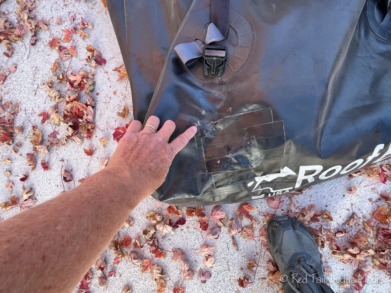 We use a roof bag (paid link) to store our paddle board and gear. During Season Five, we also stored some of our backpacking gear in there. The roof bag is supposed to be waterproof, but the buckles eventually wore holes through the bag. We taped up the holes a couple of times during Season Five, but more appeared. During our solar eclipse trip in April, we only had paddle board gear in there, so we didn’t worry too much about the small holes. However, when we got back home, we discovered the heavy rains had soaked our paddle board. Water doesn’t hurt a paddle board, unless it stays wet for long periods of time and starts to mold. So before we started our main Season Six travels, we added a lot more Gorilla tape. We were hoping that would do the trick, especially since the bag isn’t as full as before and the buckles now sit on top of the reinforce portion of the bag. However, about a month into the season, we discovered water is still finding its way into the roof bag. We’ll have to come up with another solution.
