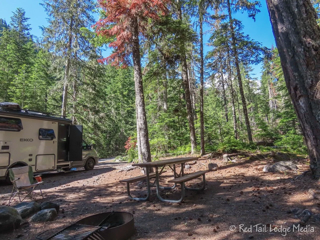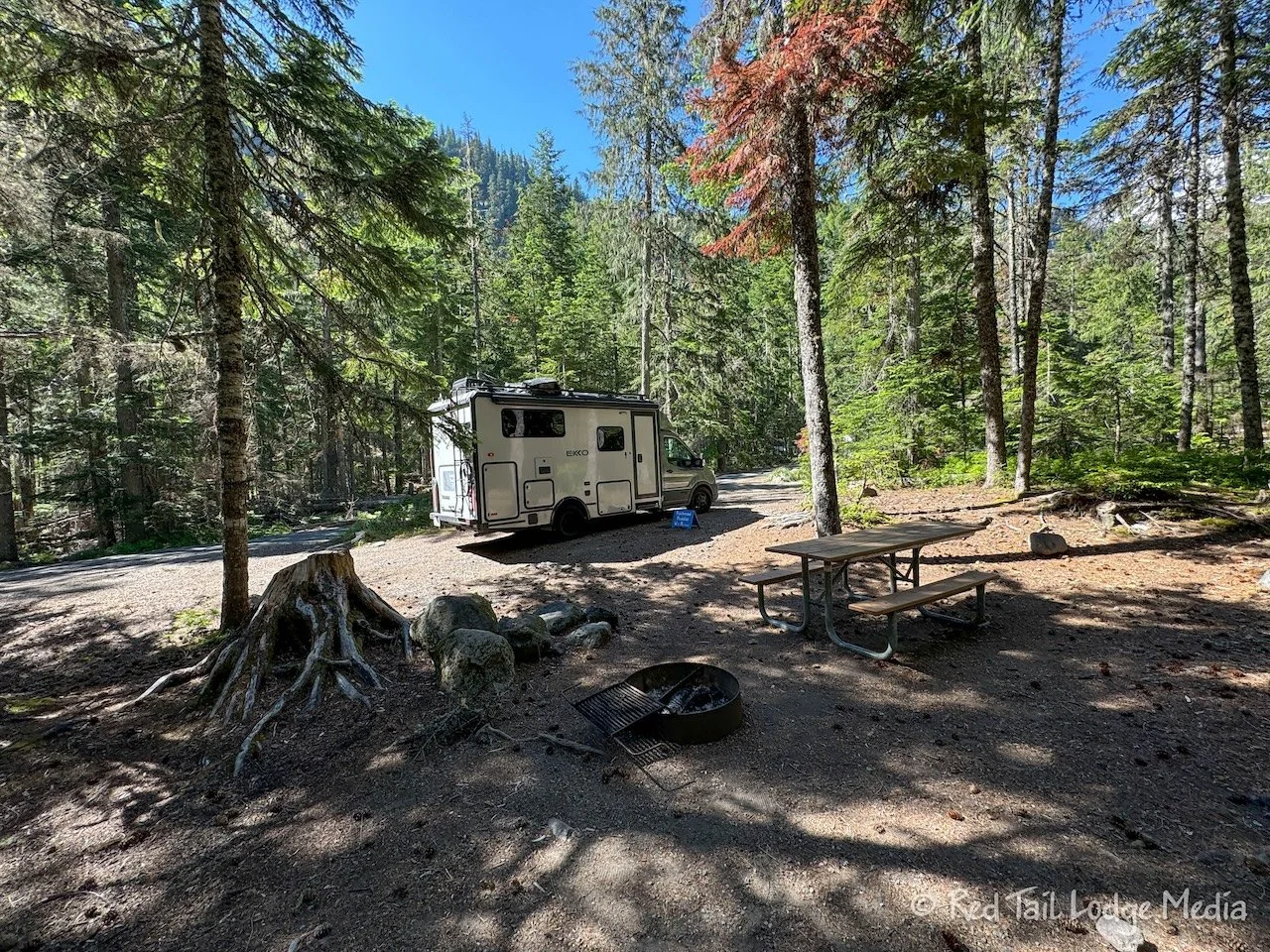 Mount Rainier requires timed entry permits between 7 am and 3 pm to enter the Paradise Corridor or the Sunrise corridor. We did not have a timed entry permit for Friday, but our Cougar Rock Campground reservation allowed us to enter the Paradise Corridor after 1 pm on our day of arrival. We had a little bit of time to kill before entering the park, so we stopped at the Bevin Lake Rest Area for a picnic lunch. We were hoping for a view of some kind, but it was just a basic rest area with a couple of picnic tables. It did have decent restrooms, which was the most important item.