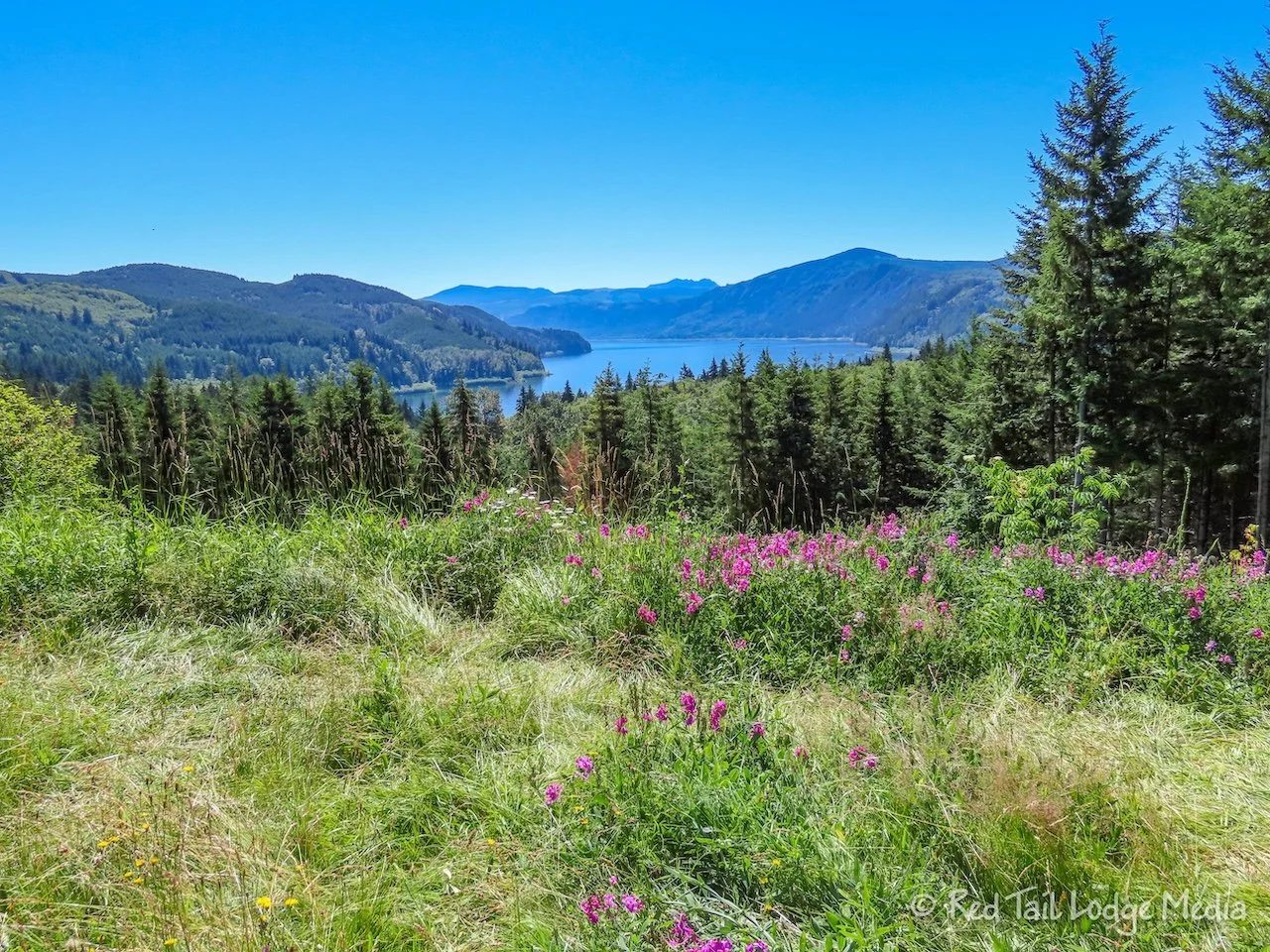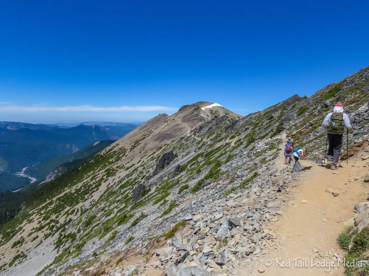 The trail on the way up was fully exposed in the sun, with gorgeous panoramic views in all directions. Even though the air temperature was a little cooler than down near Cougar Rock, it started out feeling hotter because of the sun. However, once we got on top of the ridge, there was a nice cool breeze which kept us pretty comfortable.