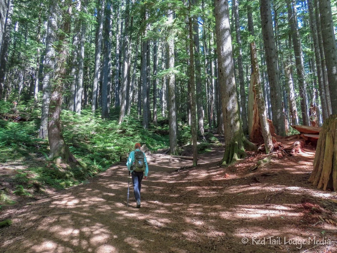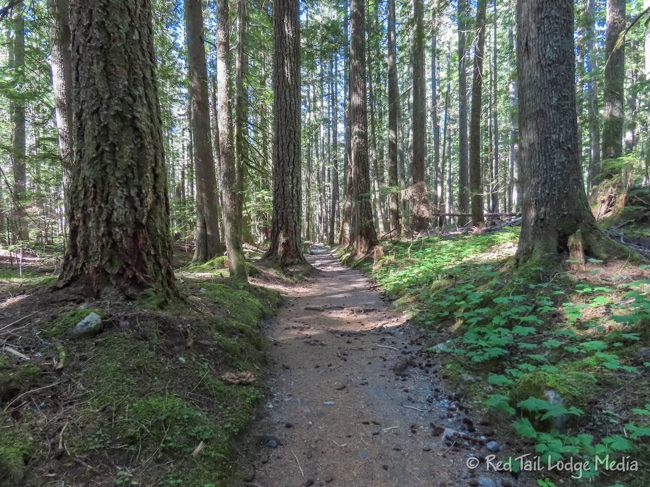 After crossing the road, we soon joined the trail we started on, closing the loop. Turning left would take us back to the campground. However, we turned right to walk the tenth of a mile back to Longmire for food.