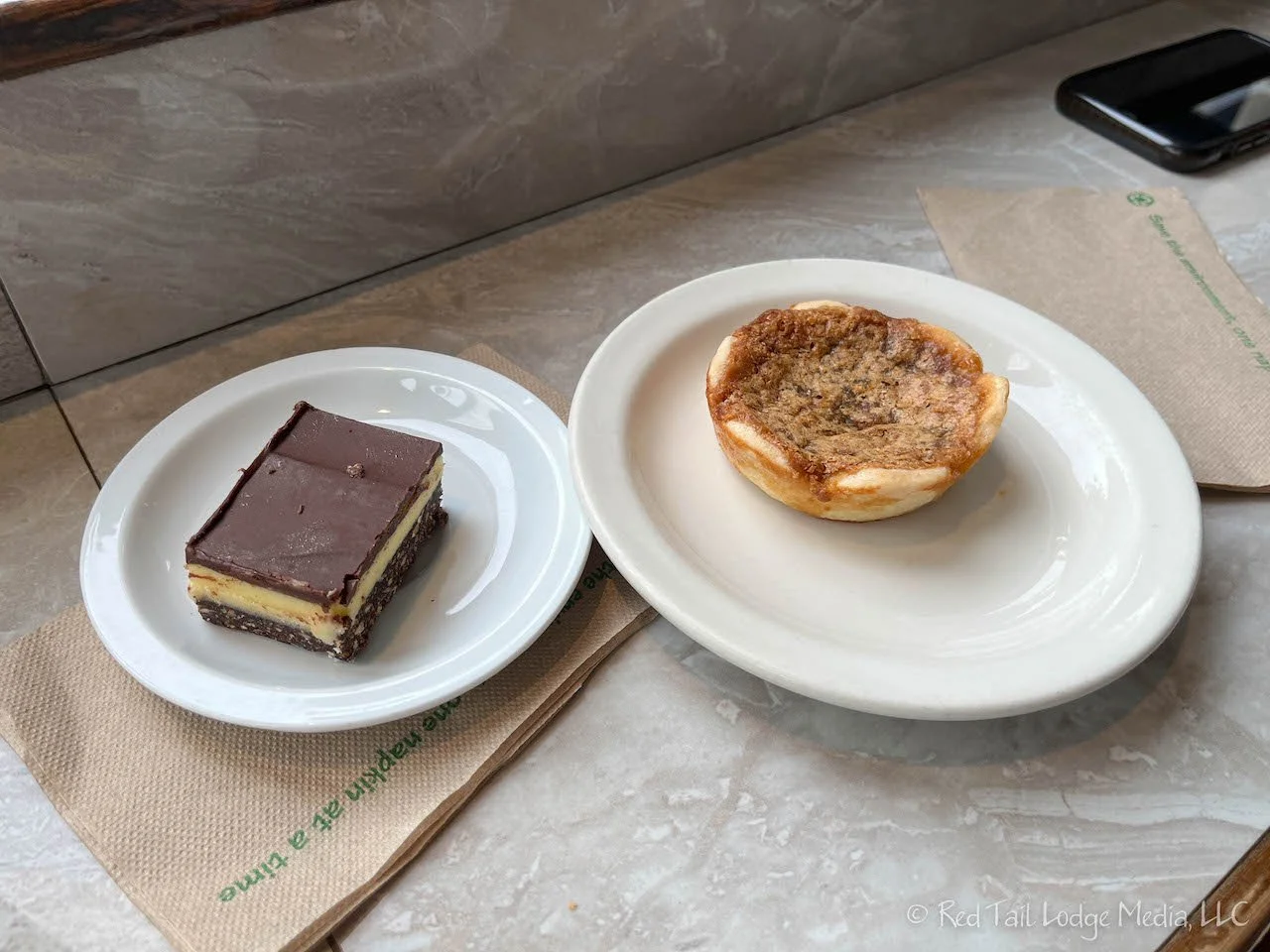 The Nanaimo bar is a dessert created in the town of Nanaimo. It is three layers, a coconut crumb base, a custard icing middle layer, and a top layer of chocolate ganache. The town even has a Nanaimo Bar Trail, with 34 stops that include not only the classic version of the treat, but there are also Nanaimo bar lattes, spring rolls, cocktails, and deep-fried Nanaimo bars. We just wanted to try the classic. Back on the Harbourfront, we walked into the Javawocky Coffee House. They sold the classic Nanaimo bar. Ann ordered one, but Keith ordered a butter tart. Neither one of us is a fan of coconut, so we weren’t sure we’d like the Nanaimo bar. However, the coconut flavor in the bar is very subtle, since there are so many other flavors competing for dominance, like the chocolate.