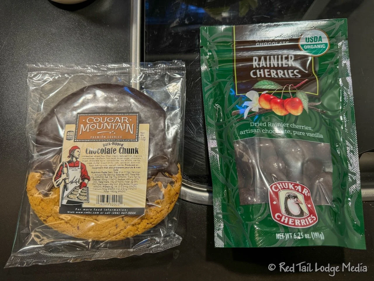 At the camp store, we were looking for ice cream treats, but the ice cream case was empty. They were waiting on a new shipment. The clerk recommended the Cougar Mountain chocolate chunk cookie and the dark chocolate Rainier cherries, so we bought both. They were both a nice dessert after dinner. Cougar Mountain is a Seattle bakery while the chocolate covered cherries were from Prosser, Washington.