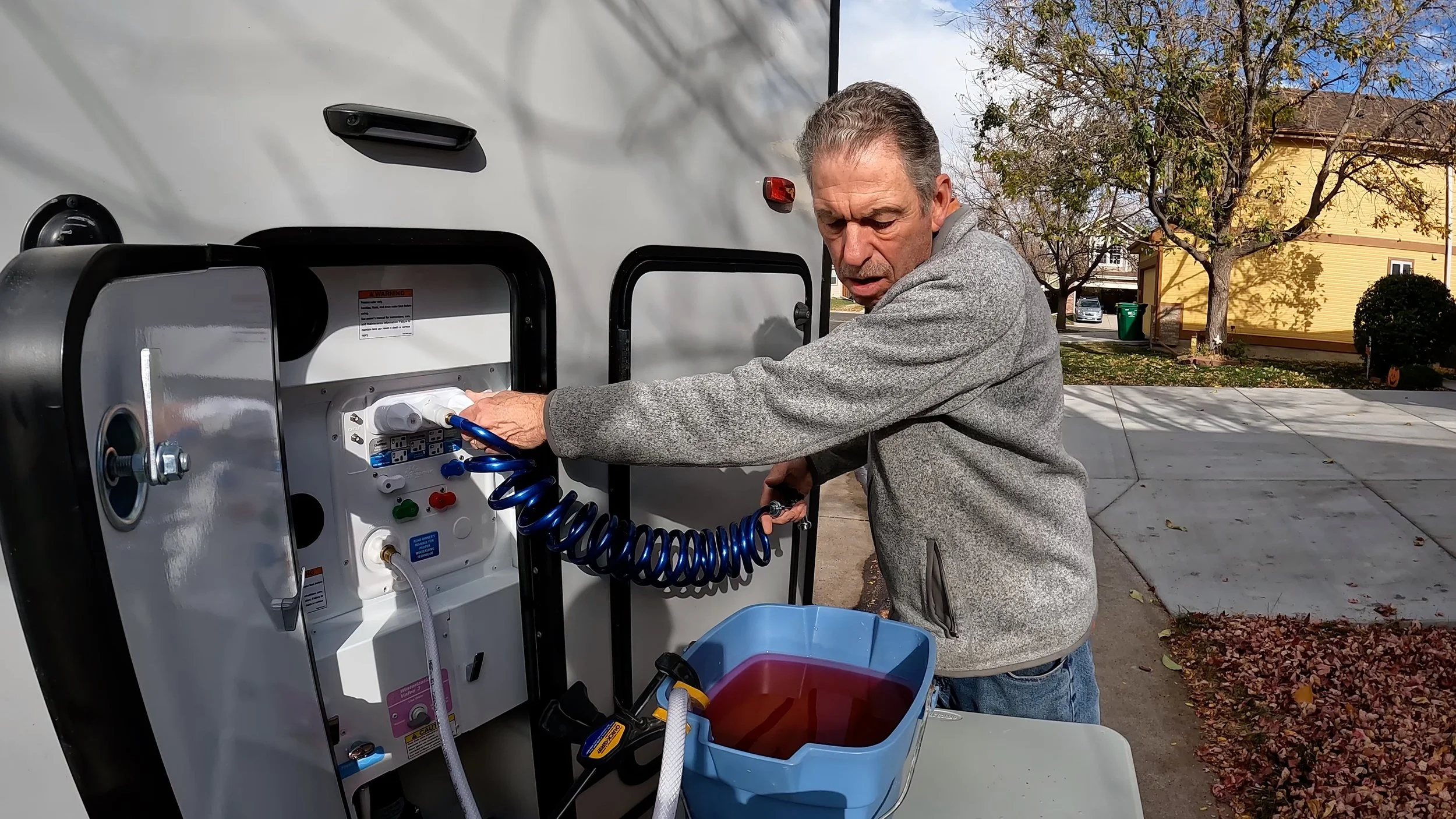 When we started the winterization procedure, we still had quite a bit of fresh water in our tanks, so step 4 of the Blowout Procedure took a while. Since water is precious in Colorado, we didn’t want all that water just running down the gutter of the street, so we put a bucket under the drain. The trees in our yard benefited from the water we emptied from the bucket, which was quite a few times before our fresh tank was empty.