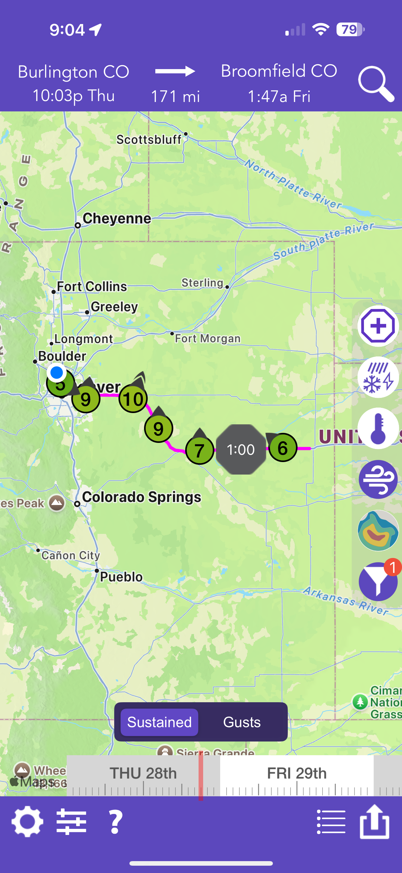If we don’t have a cell signal or Starlink connection, we request a local weather forecast on our Garmin InReach devices (paid link), which seem to connect to satellites even when Starlink cannot.