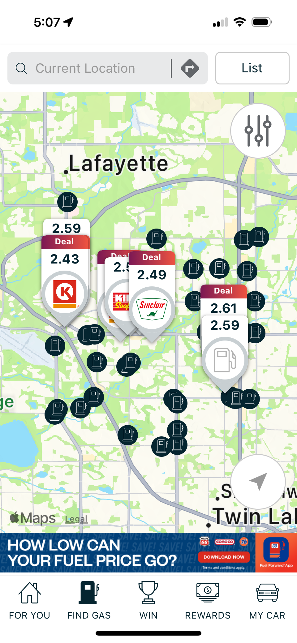 In the past, we have used the Gasbuddy app. Gasbuddy is good for finding gas stations with the cheapest prices. However, Google Maps now displays the prices for gas stations, so we’ve stopped using Gasbuddy.