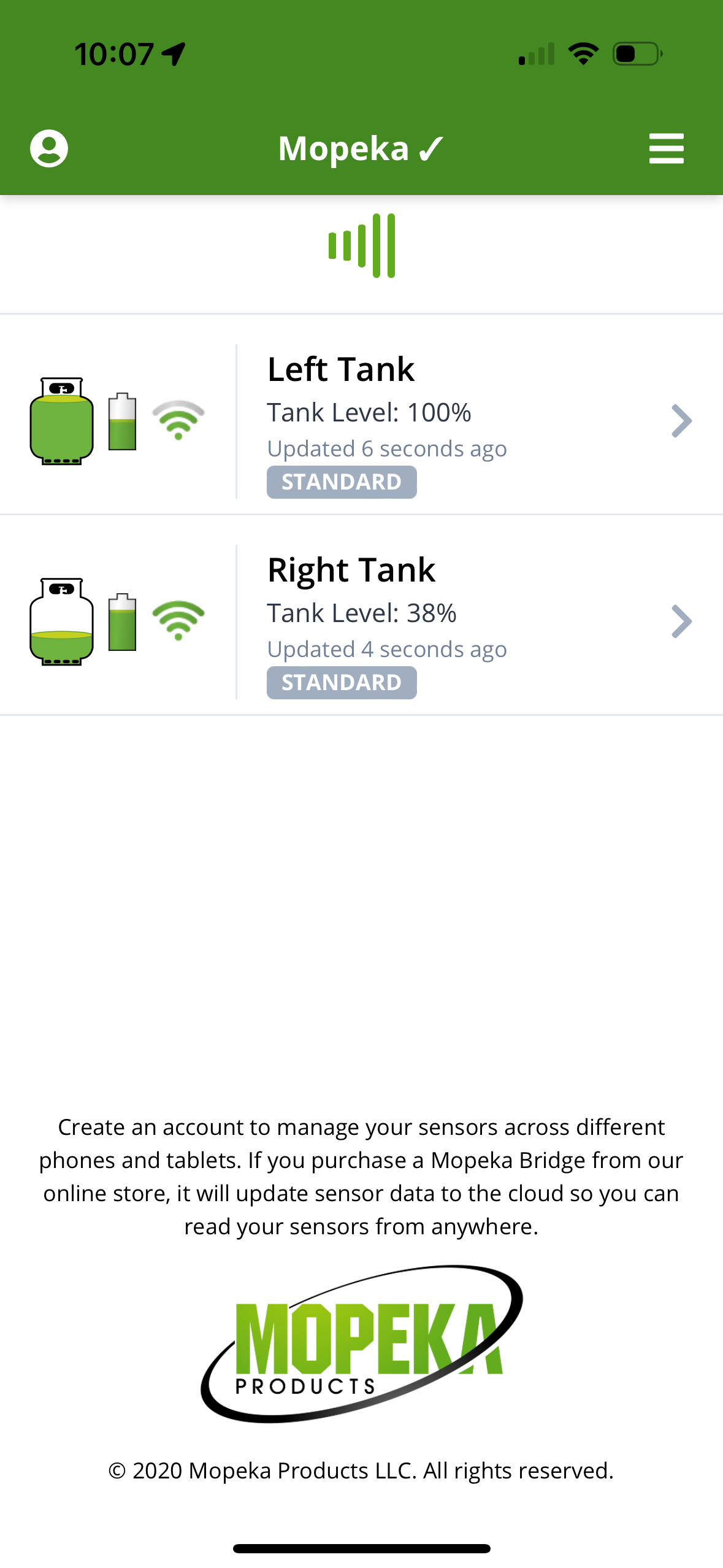 We have Mopeka sensors (paid link) on the bottom of our propane tanks, so we use the associated Mopeka TankCheck app to see the level of our tanks. The only drawback is that the batteries in the sensors barely last our long six month traveling seasons, so we have to remember to replace the batteries at the start of each season.