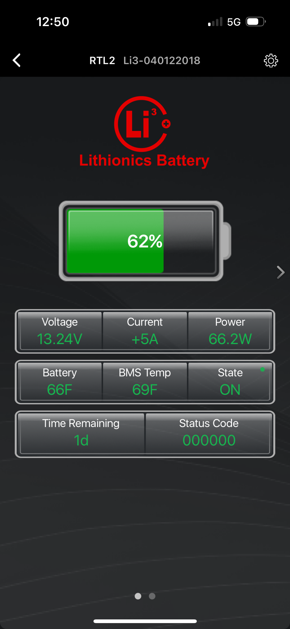 The Lithionics app shows us data on our Lithionics batteries. Only one of our phones can be connected to each of the batteries at any given time. Sometimes we have to open the app, close it, then open it again to get it to disconnect from our other phone. We have two Lithionics batteries in our EKKO. Unfortunately, the app only allows you to view the details of one battery at a time.
