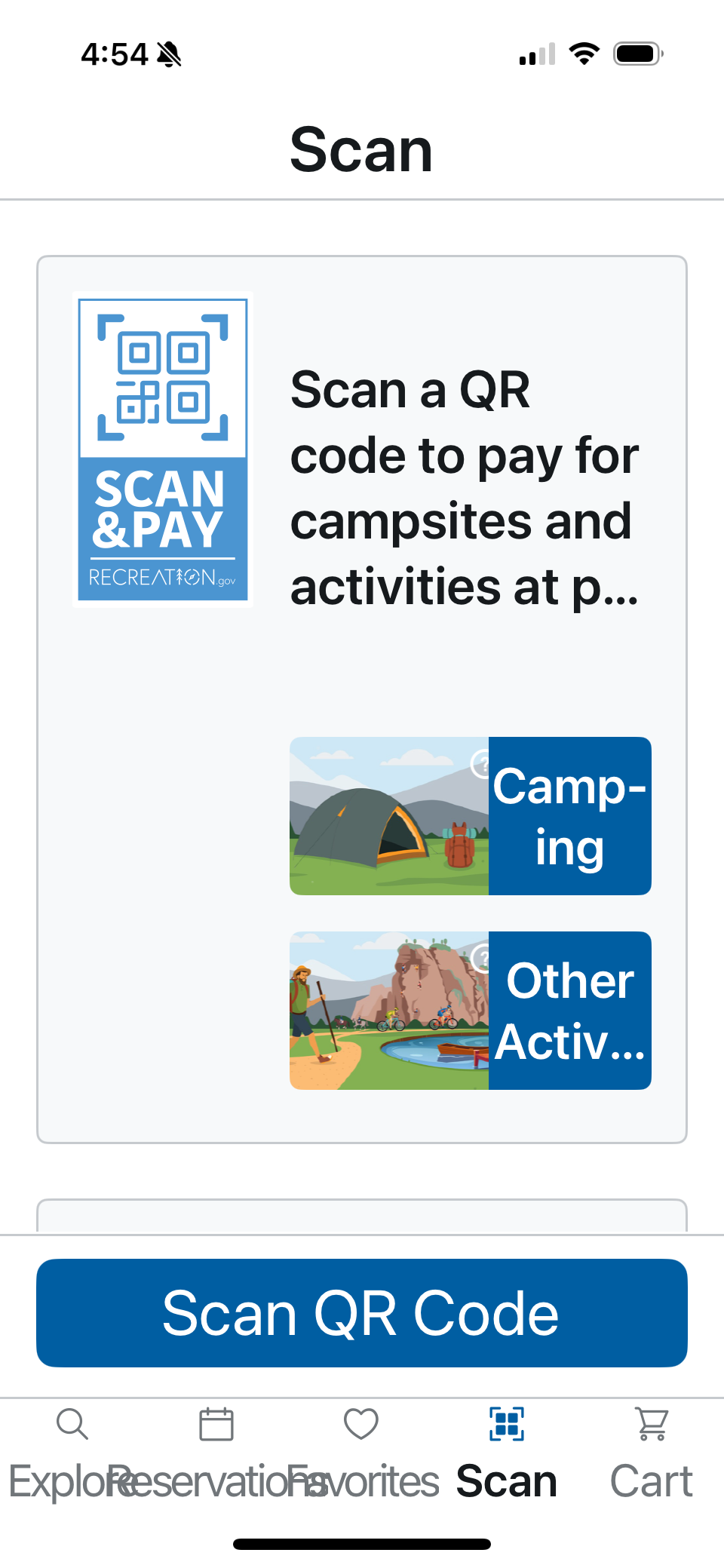 Another app we have used is from recreation.gov. (Note: the screen shots are from Ann’s phone who has the font size set to the max. Some applications don’t handle the large font size well.) Recreation.gov is the website where you go to reserve most federal campgrounds. Having the app on your phone allows you to pay for federal camp sites even when offline. However, you need to have it already installed on your phone before you lose cell service. Some federal campgrounds, such as some Forest Service campgrounds are first come/first serve. The app allows you to show up and pay for the site for campgrounds that support “Scan & Pay”, which is helpful when you don’t have the right amount of cash to deposit in an envelope. The payment will go through on your credit card once you have internet service again.