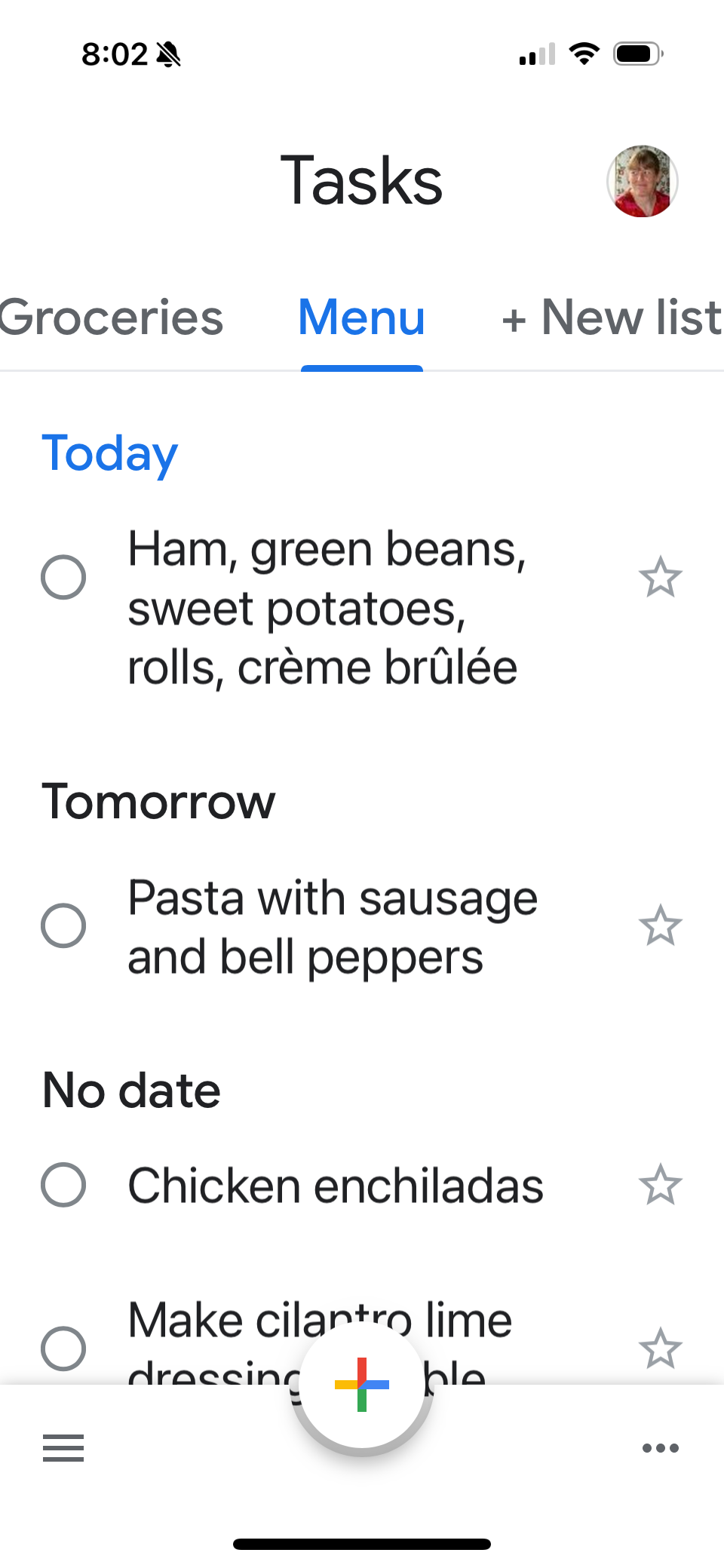 Another app Ann finds useful is the Google Tasks app. She uses it to create our menus and grocery lists. Sometimes she’ll assign each meal to a particular date, especially if there is a reason to. It might be saving leftovers for a travel day, grilling outside on a good weather day, or having a warm Instant Pot meal inside on a predicted cold, rainy day. It is similar to Check Check in that it has check lists, but, unlike Check Check, the lists are not resettable. Ann also keeps a constant My Tasks list in Tasks. As she thinks of items, she adds it to the My Tasks list. To bring priority items up to the top, she assigns a date to them. The assigned items even show up on her Google Calendar.