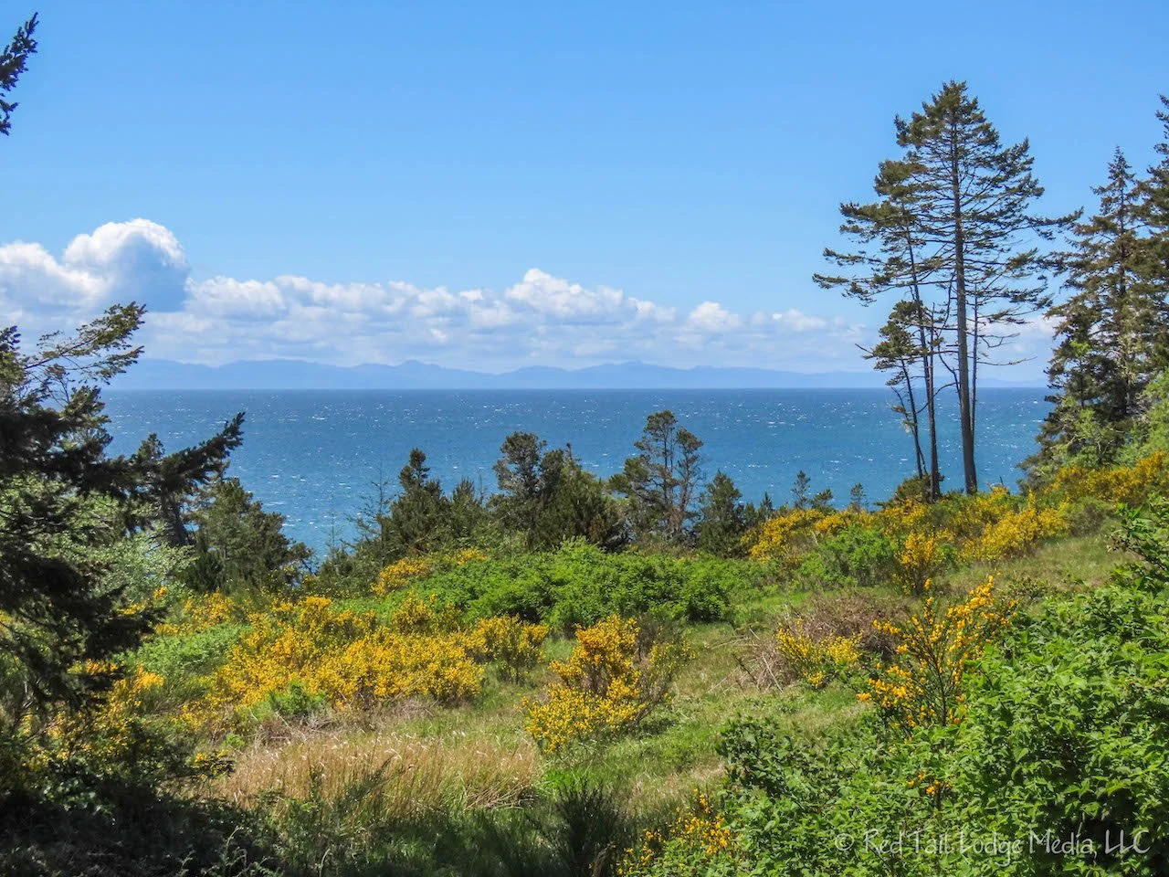 From Sooke, we continued on highway 14, which now followed along the southwest coastline of Vancouver Island. On Google Maps, there was a point along the road labeled Gordon’s Beach with a camera symbol, indicating a viewpoint. We tried to follow Google’s directions, but it wanted to take us down a road that didn’t exist. There was a little pull-off there, but there were several road construction vehicles parked there. We parked there anyway and followed the path past the concrete barrier down to the coastline. We were actually past Gordon’s Beach, we believe just past the bridge over Tugwell Creek. If we look on Google Maps now, the Gordon’s Beach viewpoint has moved and is now on the actual beach. However, the little trail we went down was nice, lined with bushes covered with vibrant yellow blossoms. We came out onto a rocky beach, where the creek flowed into the ocean. It was a pretty little spot, even though it was not Gordon’s Beach.