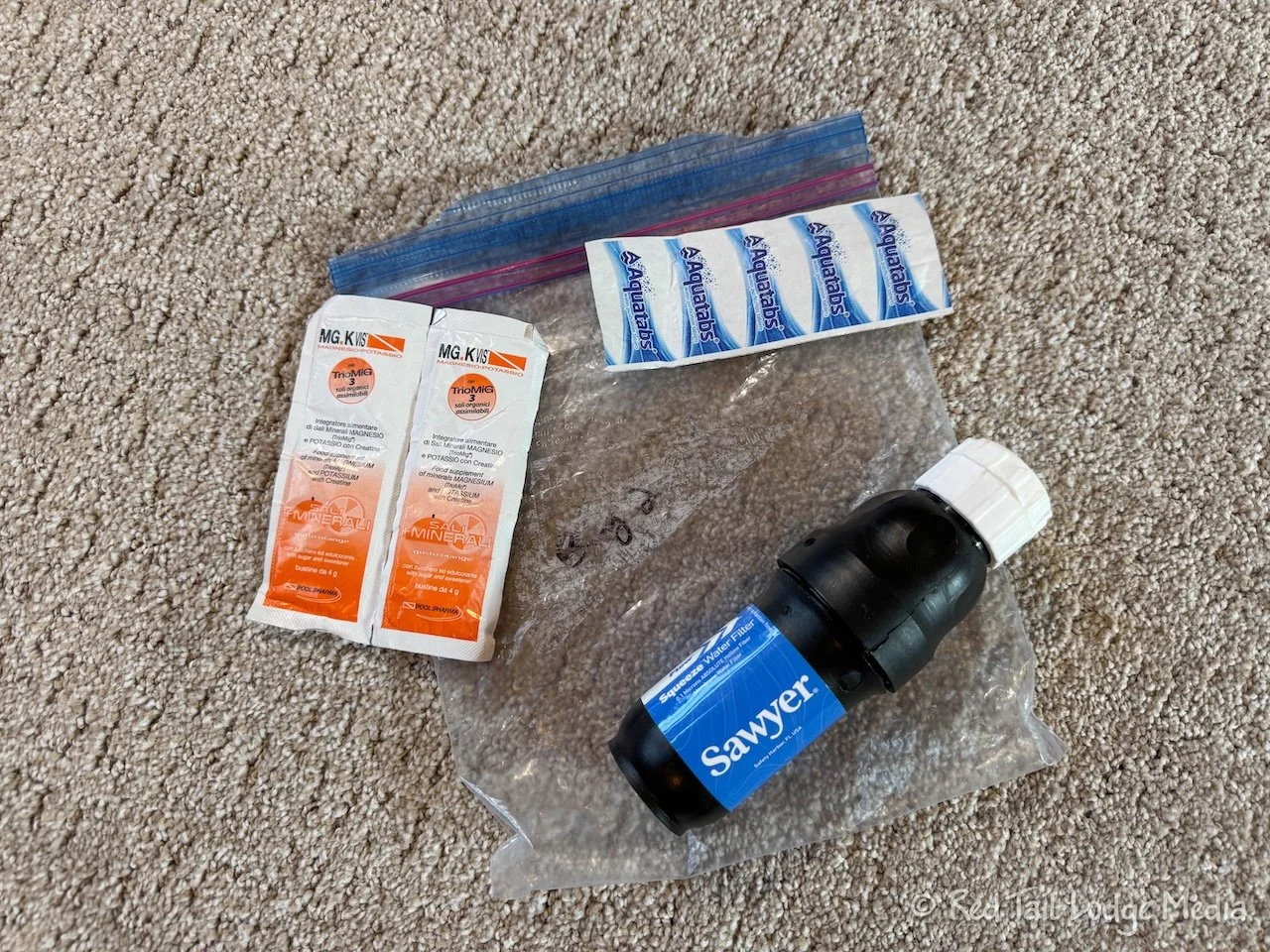 In ziplock Bag 2, was Ann’s hydration items. These included electrolyte tablets, water filter, and water purification tablets. The water filter fits onto the Cnoc collapsible bottle for filtering water. She can either drink it directly from the filter while it is on the bottle, or squeeze it into her main water bottle. The ziplock bag kept these items clean and dry.