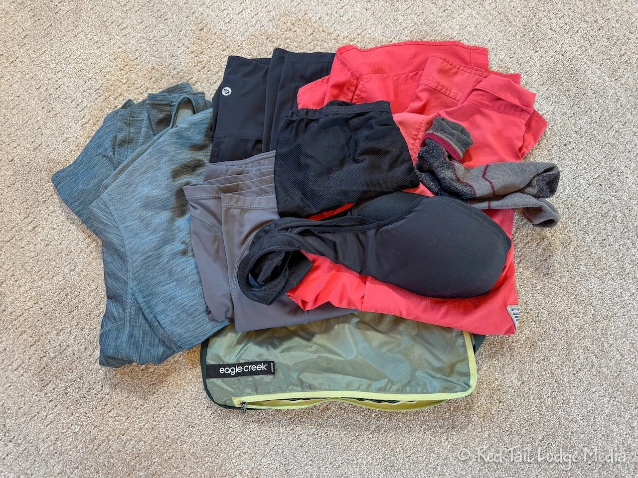 In the medium black compression cube was spare gear that wasn’t needed for the TMB. These things included her swim suit, her padded bike shorts, a phone mount for attaching to bike handlebars, and a leg strap to keep her pants leg out of the bike chain.