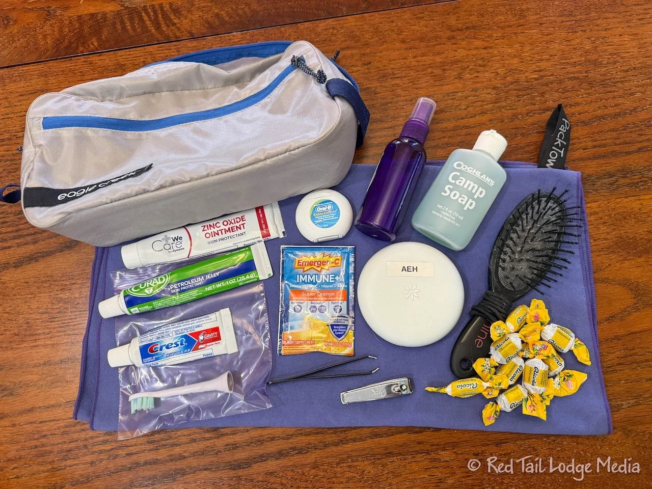 Ann’s toiletry kit included a 2 oz bottle of Campsuds, dental floss, a spray bottle of rubbing alcohol, a small ziplock bag containing the head of her small electric toothbrush, a hair brush, hair bands, retainers and case, a small tube of toothpaste, tweezers, nail clippers, a 1 oz tube of petroleum jelly, a 1 oz tube of zinc oxide, and a camp towel. Since Ann was recovering from a cold, she also added some immune boost tablets along with some Ricola cough drops. The Campsuds were for hand washing clothes, washing her body, and washing her spork utensil. The rubbing alcohol is what Ann used for deodorant, cleaning her laptop screen, cleaning glasses, and could be used to disinfect wounds. The petroleum jelly was for preventing chaffing and the zinc oxide is for quickly healing any chaffing that might occur. After having some bad chaffing on the Appalachian Trail (Day Three on the Appalachian Trail - July 31, 2019), Ann doesn’t travel without these two items. To save a little weight, Ann only brought the head to her electric toothbrush and used it as a small regular toothbrush. The camp towel was needed since many of the places we stayed did not provide towels.
