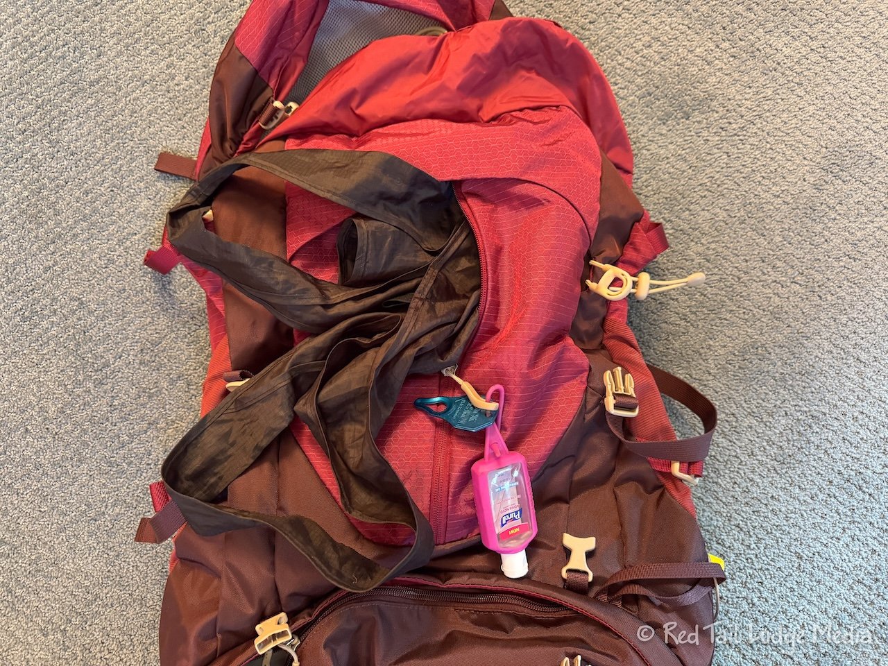 In the rain cover compartment, inside a ziplock bag, were the necessities in case Ann needed to use the great outdoors as a bathroom. Inside the ziplock bag was a small, lightweight shovel (paid link), a small amount of toilet paper, a pee cloth, and another ziplock bag for dirty TP. She could use the pee cloth, which would attach to the outside of the pack after use to dry until she reaches a place to wash it, but that won’t work for number two. Keeping the toilet bag in the rain cover compartment keeps it as far away from our other gear as possible, so as not to contaminate anything.
