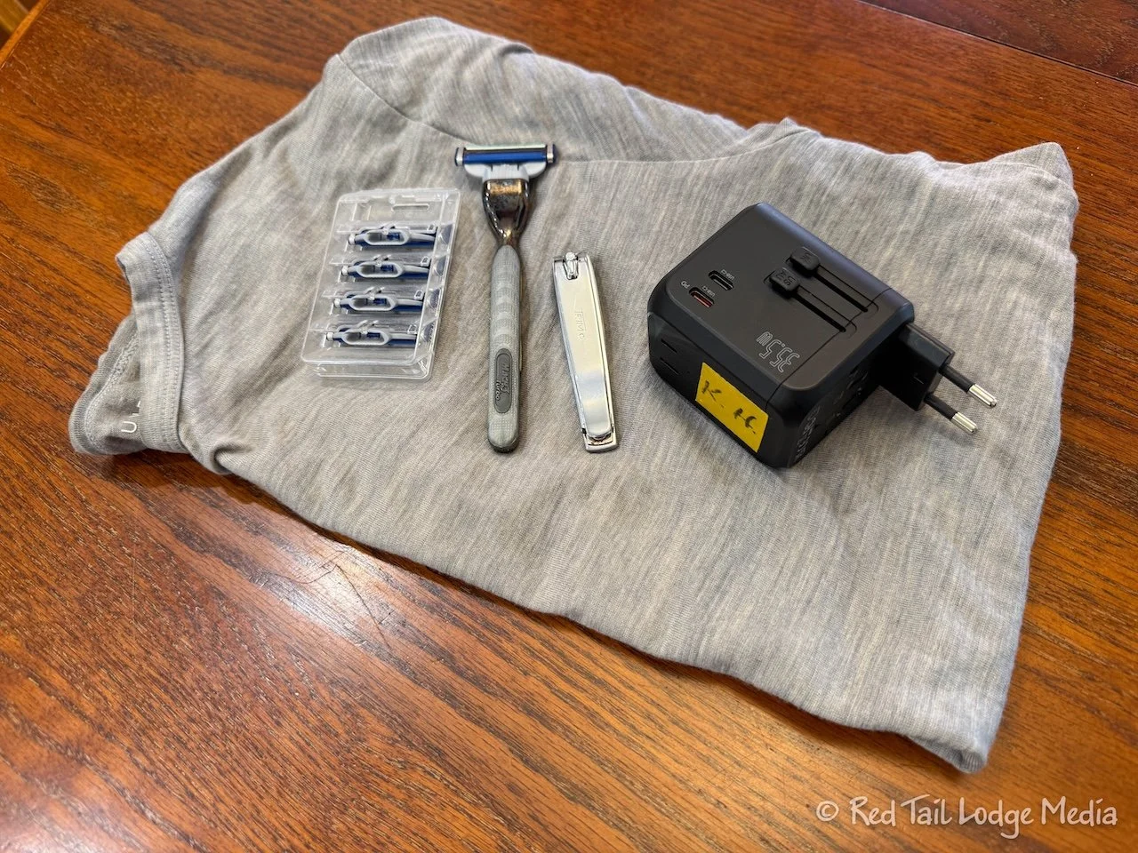 Keith did not carry a laptop or any of the camera gear that Ann was carrying, but he did carry a few items that Ann didn’t. In addition to his merino wool t-shirts, he had some additional medications that he needed, the toe nail clippers, a razor with spare blades, and a universal electrical adapter. There were enough connections on the universal adapter that we could both use it at the same time.