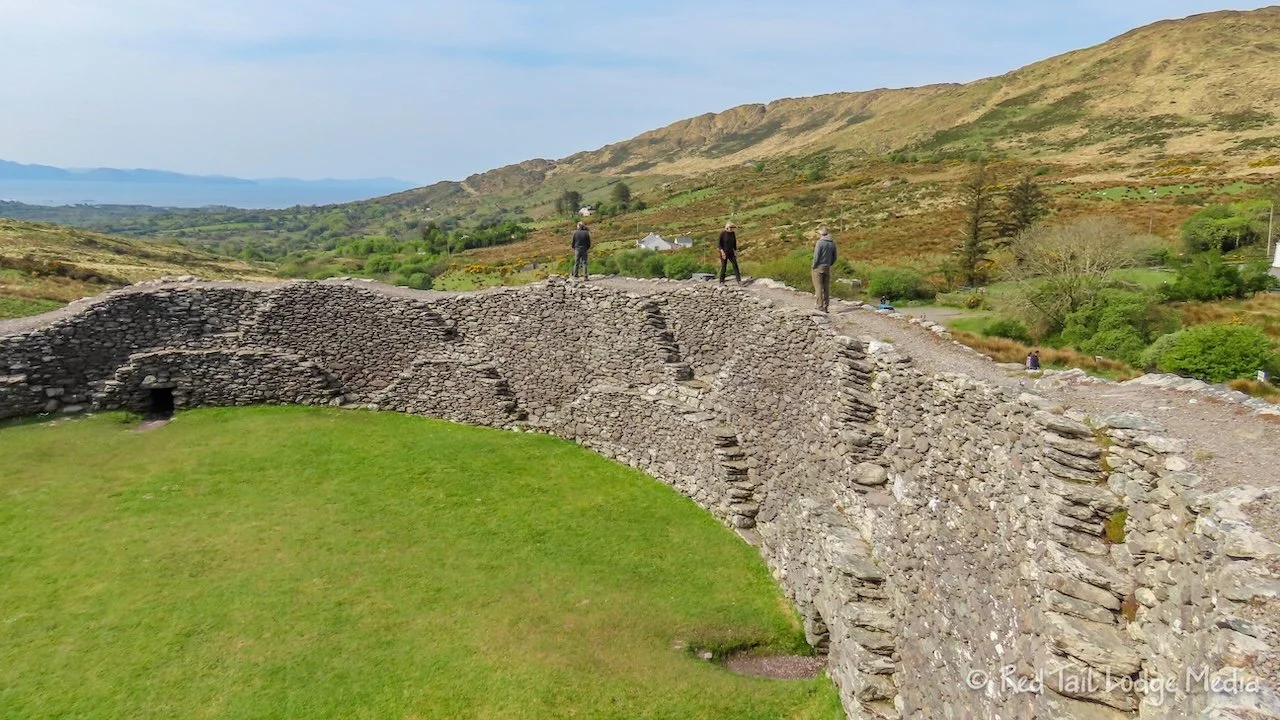 Our first stop along the way was the Staigue Ring Fort. The fortification was built between 500 BC and 300 AD. It is stacked stone without any mortar or cement. The circular wall is 12 feet thick at the base and 25 feet high. There are steep steps at several places along the wall on the inside where you can scramble up to the top of the wall for a different perspective.