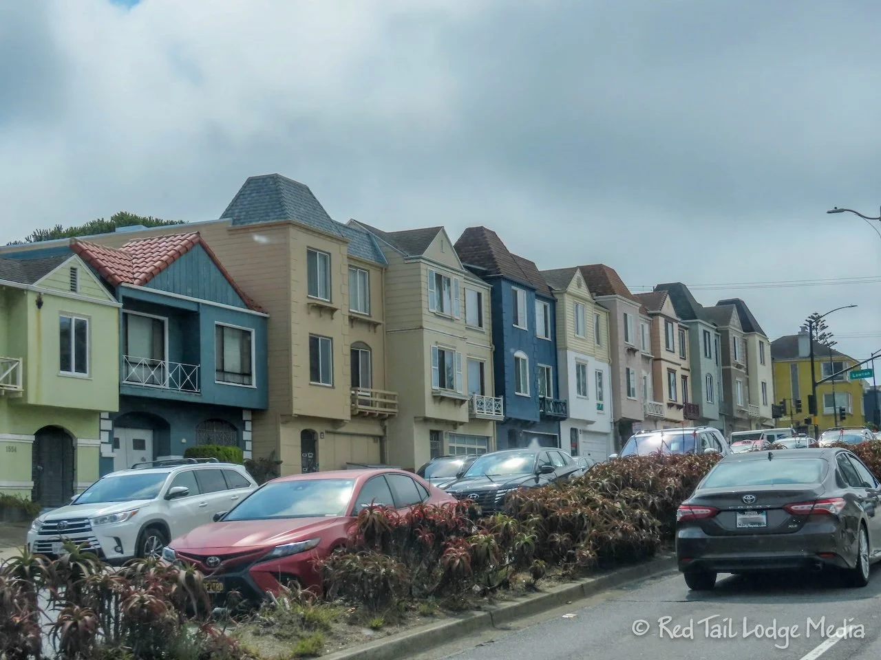 Highway 1 had joined US 101 in Sausalito. Then, after the bridge, Highway 1 continues straight through the neighborhoods of San Francisco. The town homes and houses alongside the highway were cute, but we wouldn’t want to be pulling out of their driveways onto the highway. Most of the homes had garages on the ground floor, with one or two stories above them. We imagine each block having courtyards in the center. The neighborhoods looked very inviting, with a sense of community. Not bad for a large city.