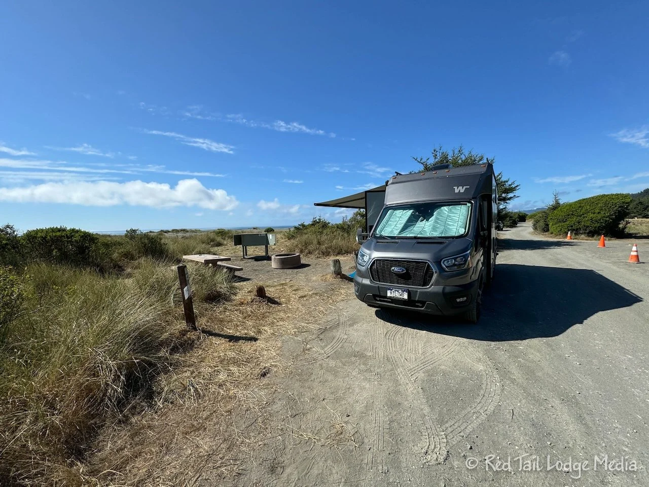 Then we drove the rest of the way down Davison Road to Gold Bluffs Beach Campground, six miles away. Just past the day use area, Davison Road turns to dirt. Vehicles wider than 8 feet or longer than 24 feet are not allowed, neither are trailers. We had heard that the road is pretty rough, but we didn’t find it too bad. Of course, ever since Olympic National Park, we now compare dirt roads to the Donkey Creek Road that we gave up on, so the bar is pretty low (Olympic National Park: South, Washington - July 22nd to 24th, 2024).