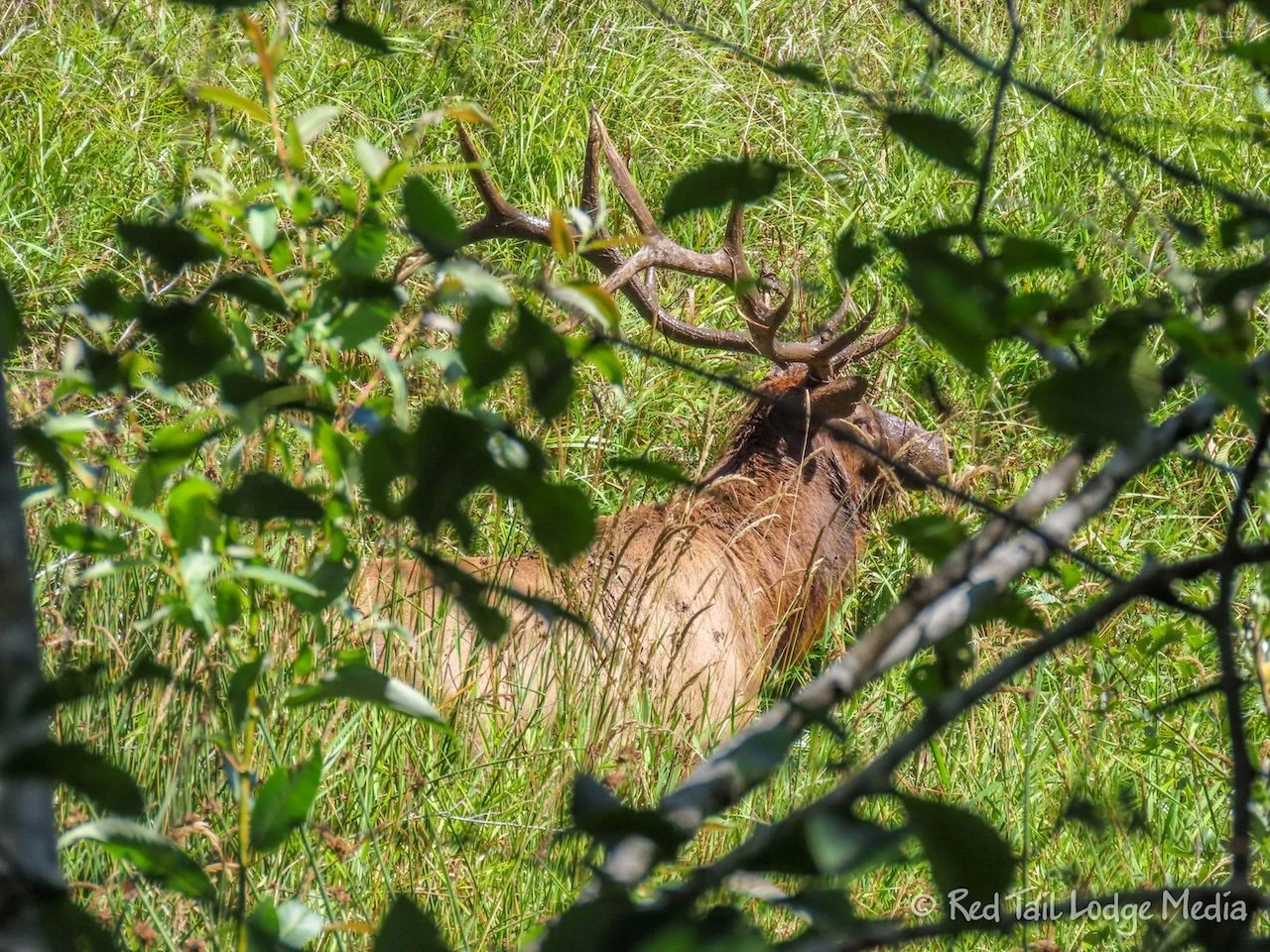At the end of the hike, the trail follows alongside Elk Meadow. A line of trees separates the trail from the meadow, providing a natural wildlife blind. A herd of cow elk were at the edge of the meadow, entering into the woods. At the end of our hike, Ann walked up to the deck by the platform. She heard a bull elk bugle and caught a glimpse of a large bull elk, so naturally, she went back down to the path alongside the meadow to try to get a picture. She walked all the way to the road where she could get a clear view across the meadow. Two bull elk were standing in the meadow, looking back at her, but they were younger than the one she caught a glimpse of. Then she walked back down the path to get back to the parking lot. Along the way, she was able to see a few more bull elk through the trees, including the really big one with a large rack.