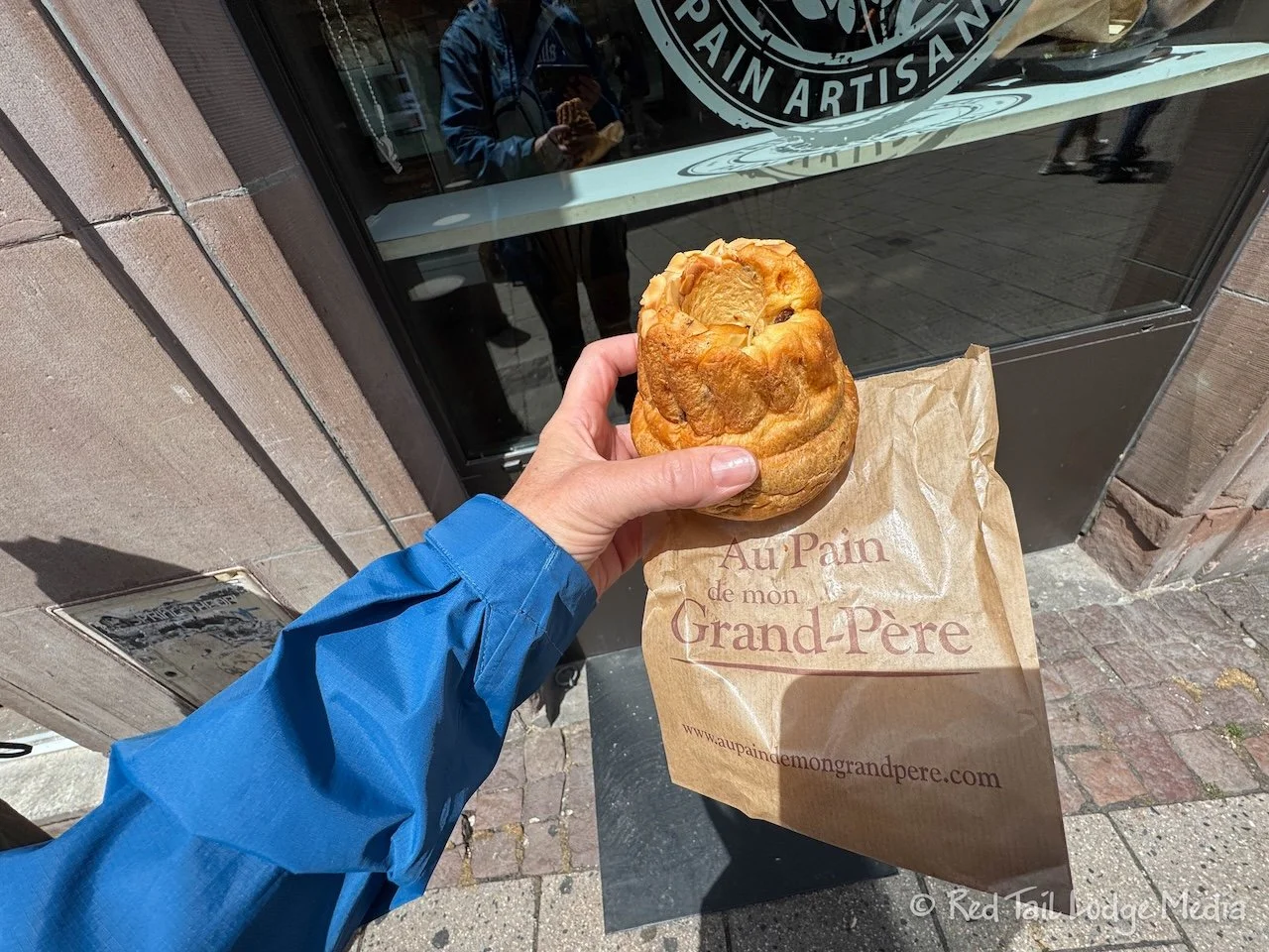 The next shuttle bus wasn’t until 2:10 pm, over an hour and a half away. So we went in search of a bakery to try some real Koegelhopf. We ended up at Au Pain de mon Grand-père (To the bread of my grandfather). We bought a small one, as we were not hungry, but still wanted to try it. We wouldn’t classify Koegelhopf as a cake. It is closer to a raisin bread. It is a sweet yeast dough with raisins, topped with slivered almonds. It is baked in a small bundt pan, giving a distinctive shape.